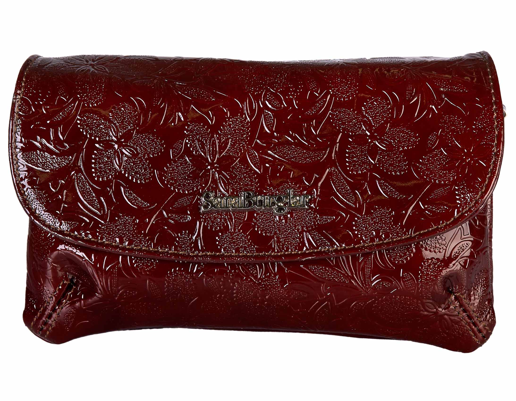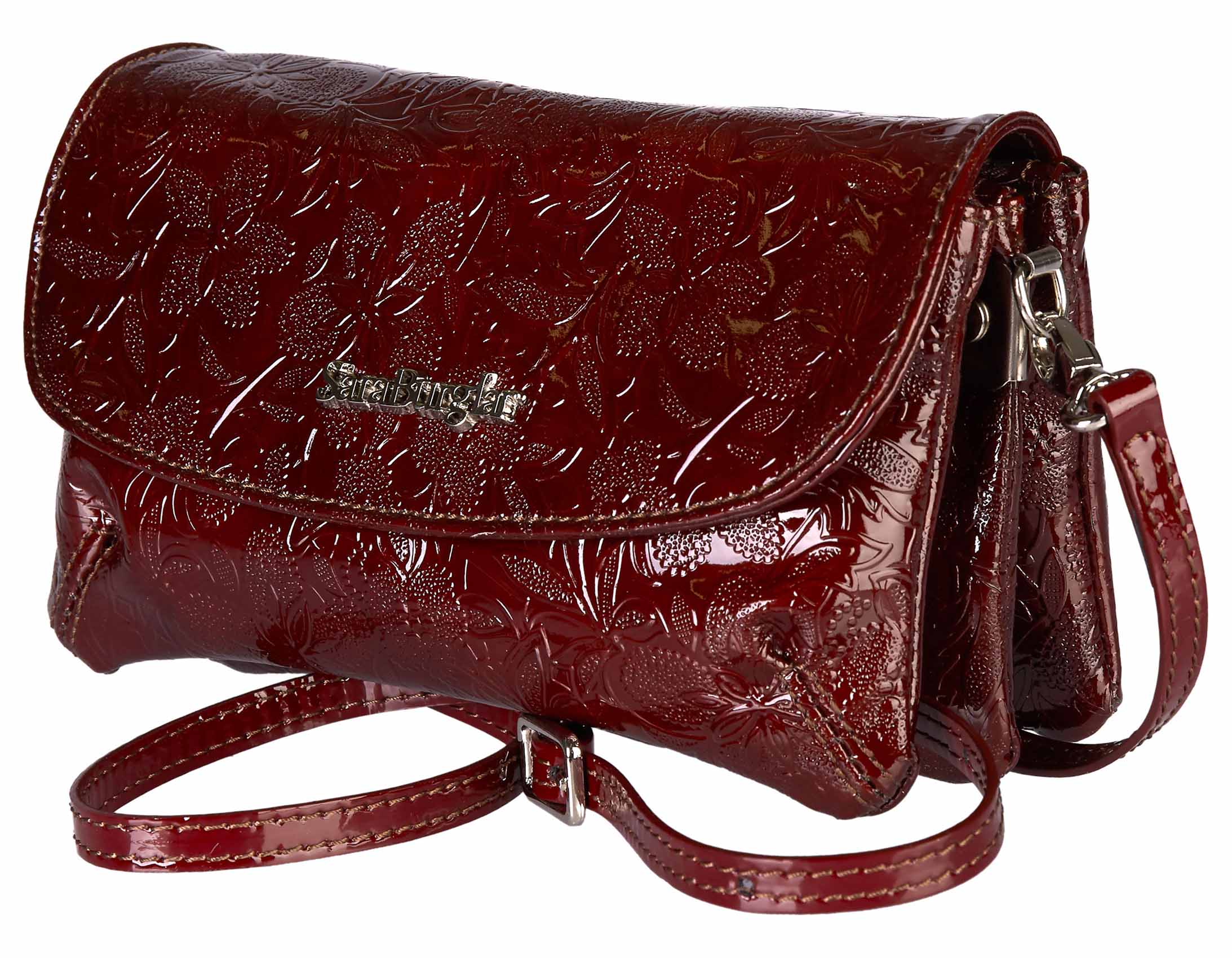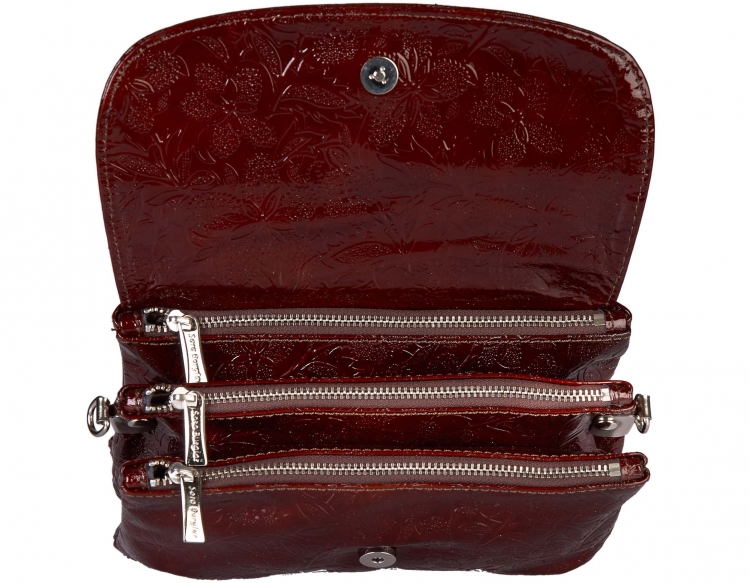 Размер 20 х 13 х 6 см. Сумка выполнена из натуральной лаковой кожи, имеет три независимых отделения на молнии, съемную длинную ручку на плечо.