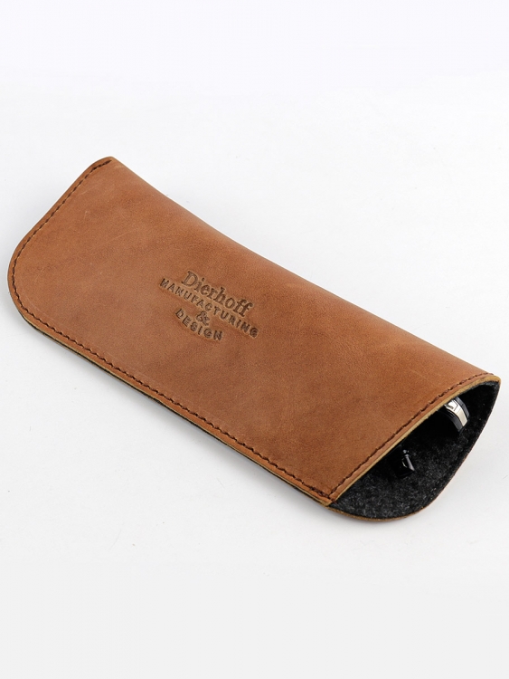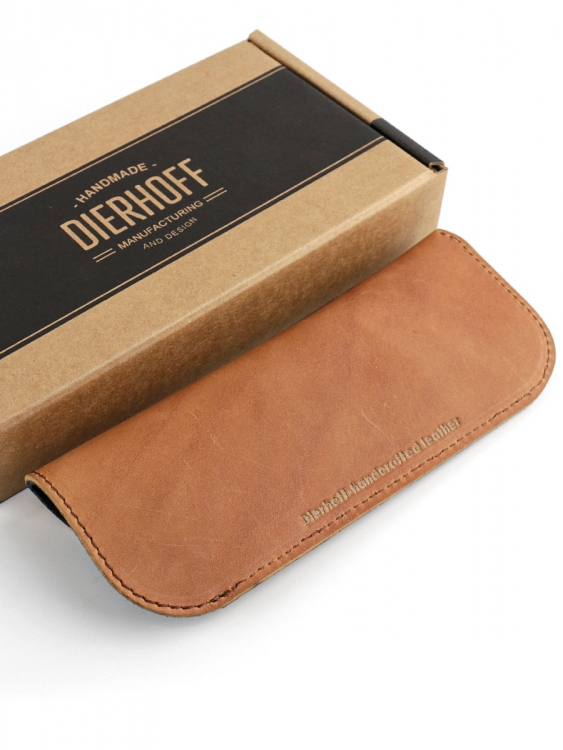 Размер 6,5 х 17,5 см. Чехол для очков изготовлен с использованием значительной доли ручного труда из высококачественной, плотной кожи "Крейзи Хорс", которая держит форму без картона или пластика, неприхотлива, надёжна. Потертости, неизбежно возникающие при носке подобных изделий, только улучшают внешний вид, придают ему брутальную винтажность. Со временем в местах наибольшего трения цвет кожи может меняться на более насыщенный, даря изделию неповторимый шарм и ощущение благородной старины. Уникальность кожи Crazy Horse в том, что царапины легко удалить, для этого достаточно потереть дефект мягкой тряпочкой или пальцами и он исчезнет. Очечник упакован в подарочную коробку Dierhoff.
