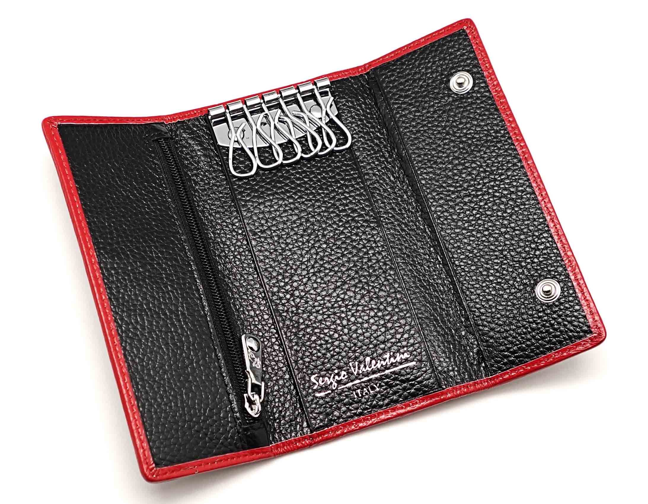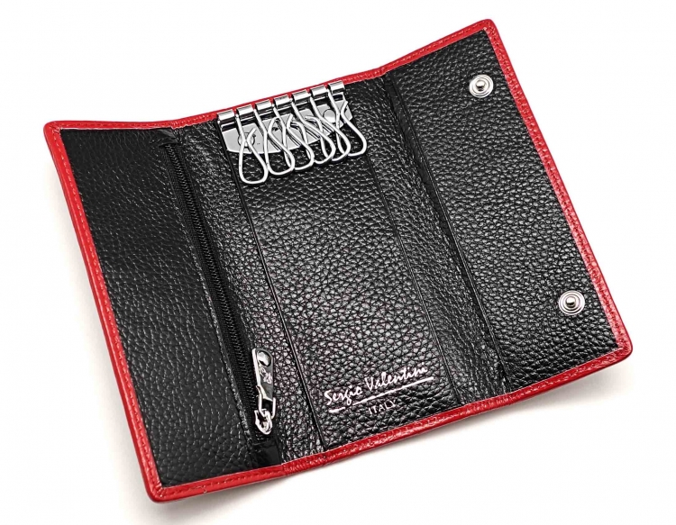 Ограниченная серия аксессуаров, изготовленных из мягкой натуральной кожи и декорированных аппликацией. При производстве этой ключницы использована значительная доля ручного труда. Размер 6,5 х 13,5 х 1,5 см. Закрывается клапаном на двух кнопках. Внутри 6 держателей для ключей, внутренние боковые стороны ключницы имеют три кармашка, один из которых на молнии.