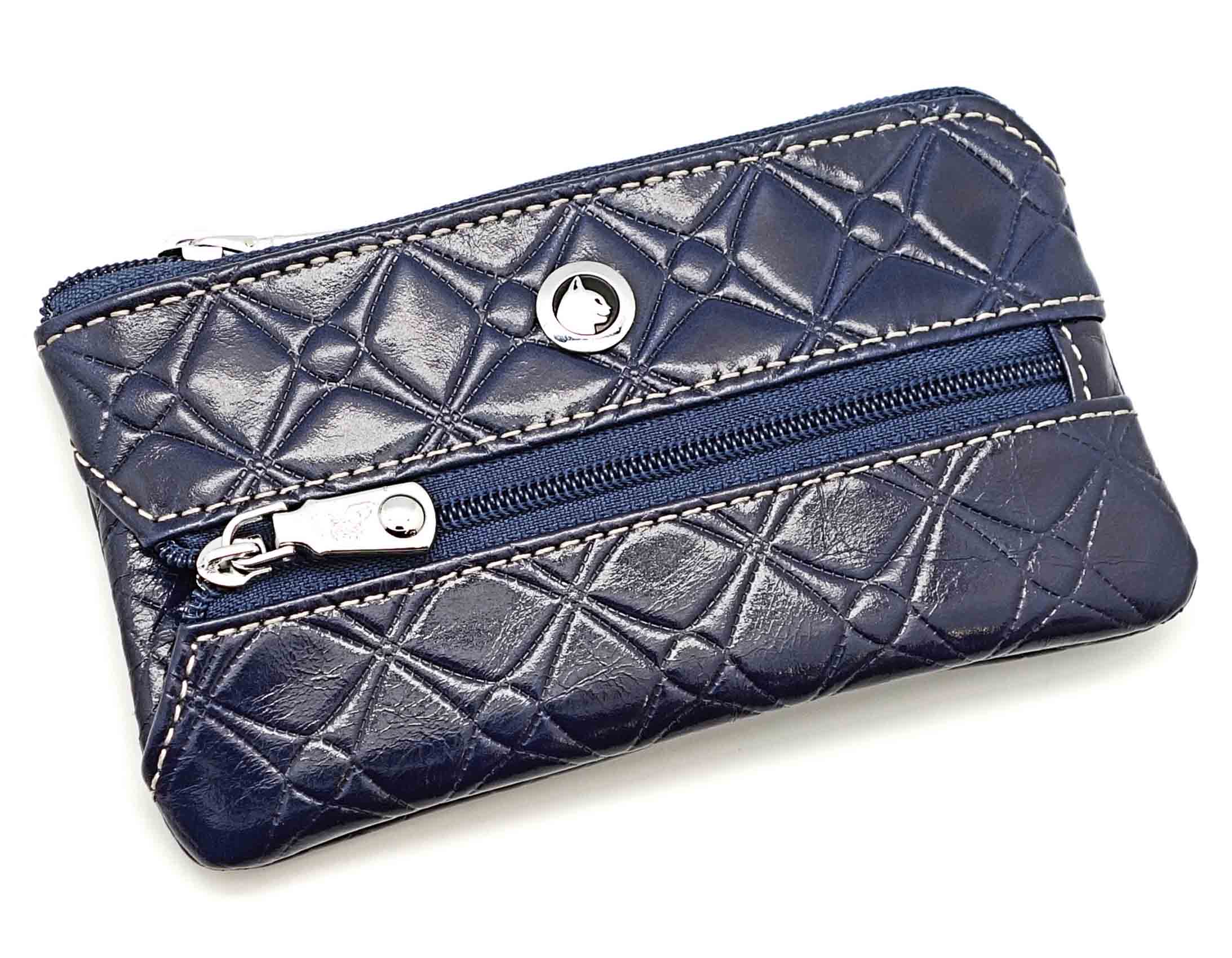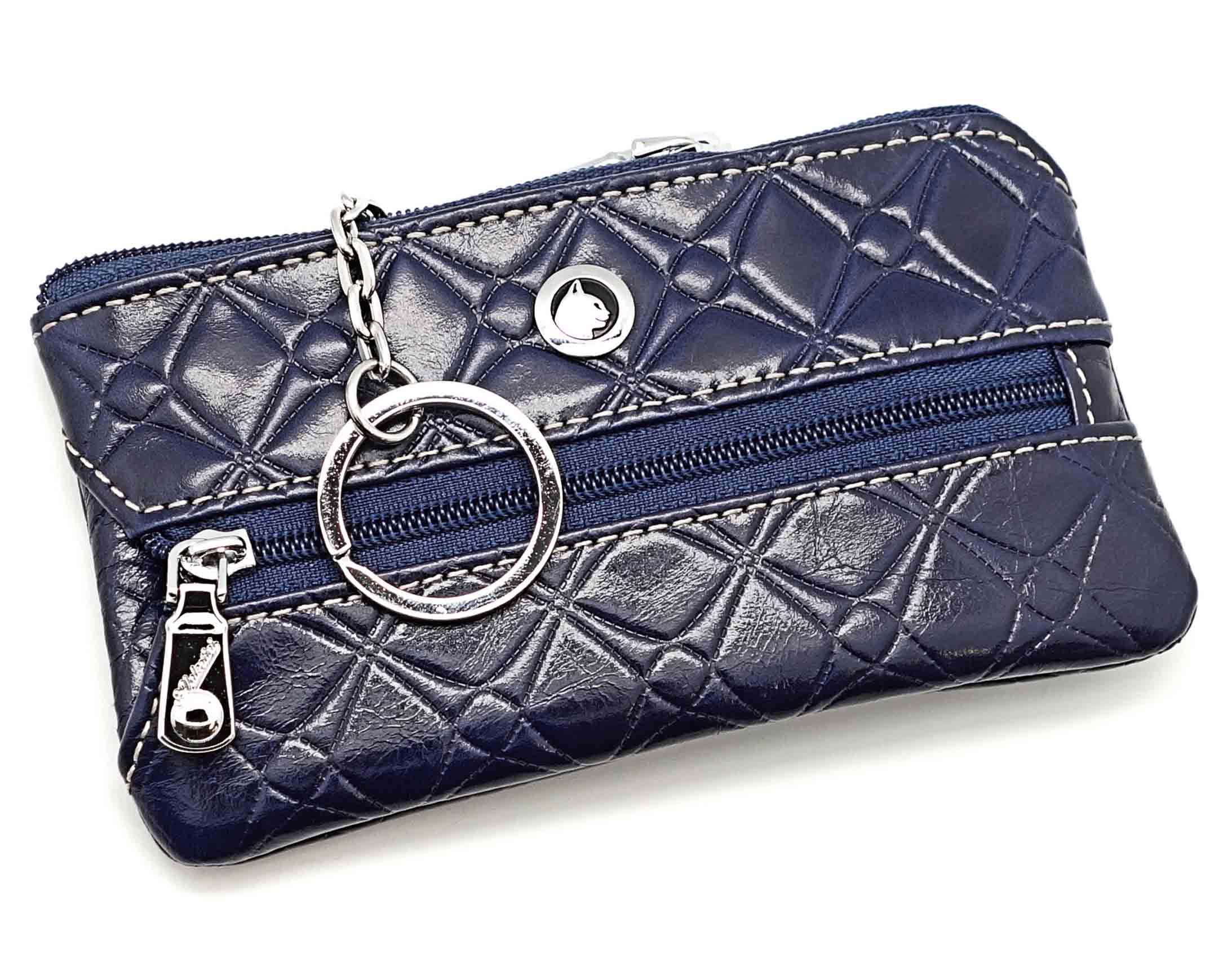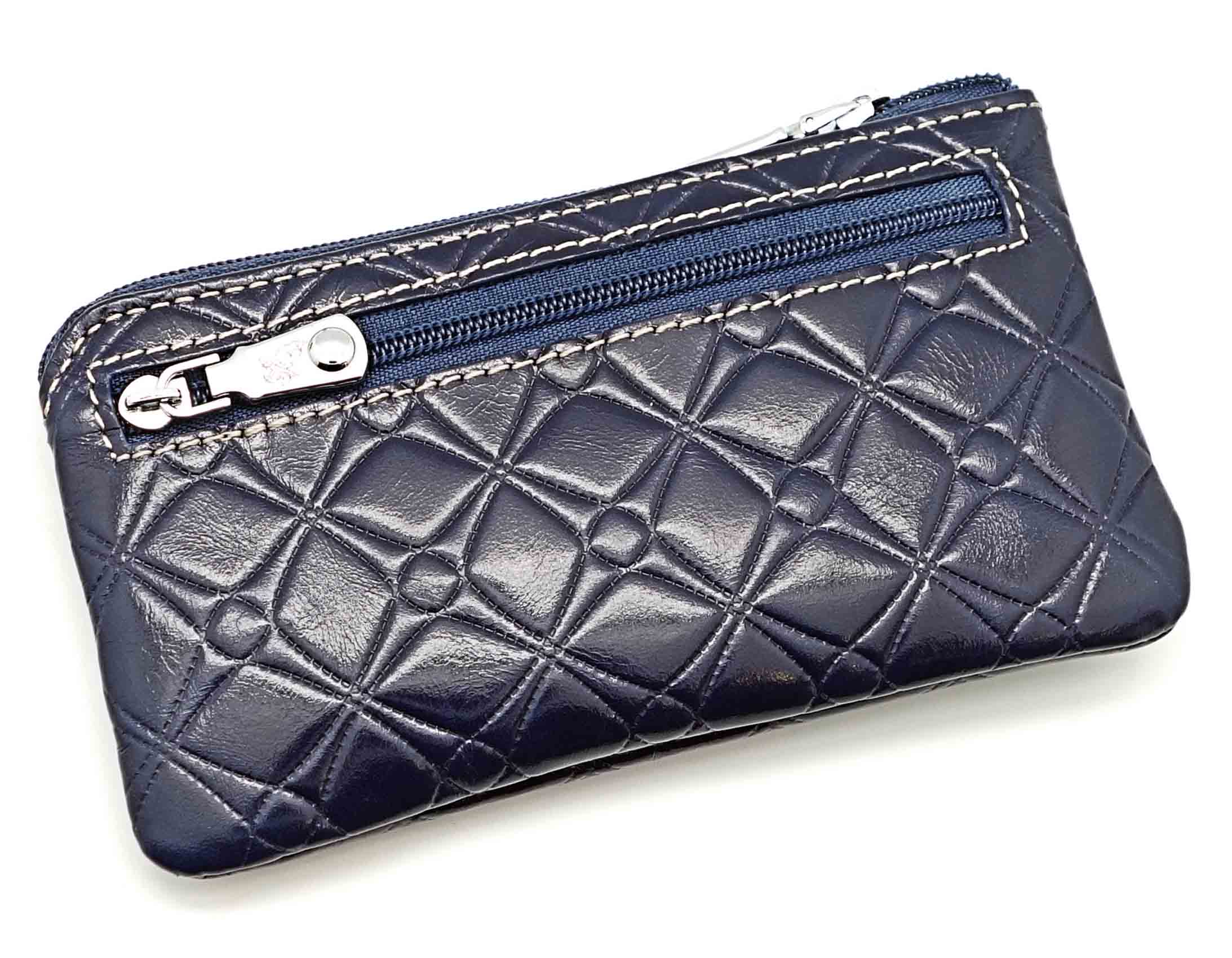 Размер 13,5 х 7,5 см. На лицевой стороне расположен карман на молнии с шестью крючками для ключей, на оборотной- кармашек на молнии для мелких предметов. Центральное отделение также закрывается на молнию, внутри металлическая цепочка с кольцом.