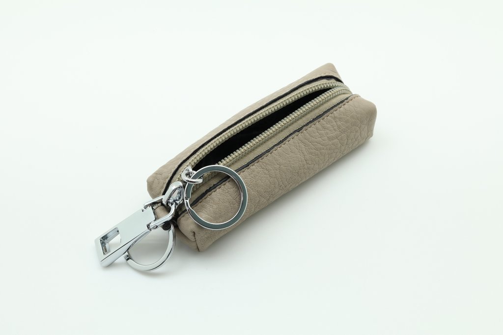 Размер 10.5 х 4 х 1,5 см. Закрывается на молнию. Внутри металлическое кольцо на цепочке. Снаружи металлическое кольцо.