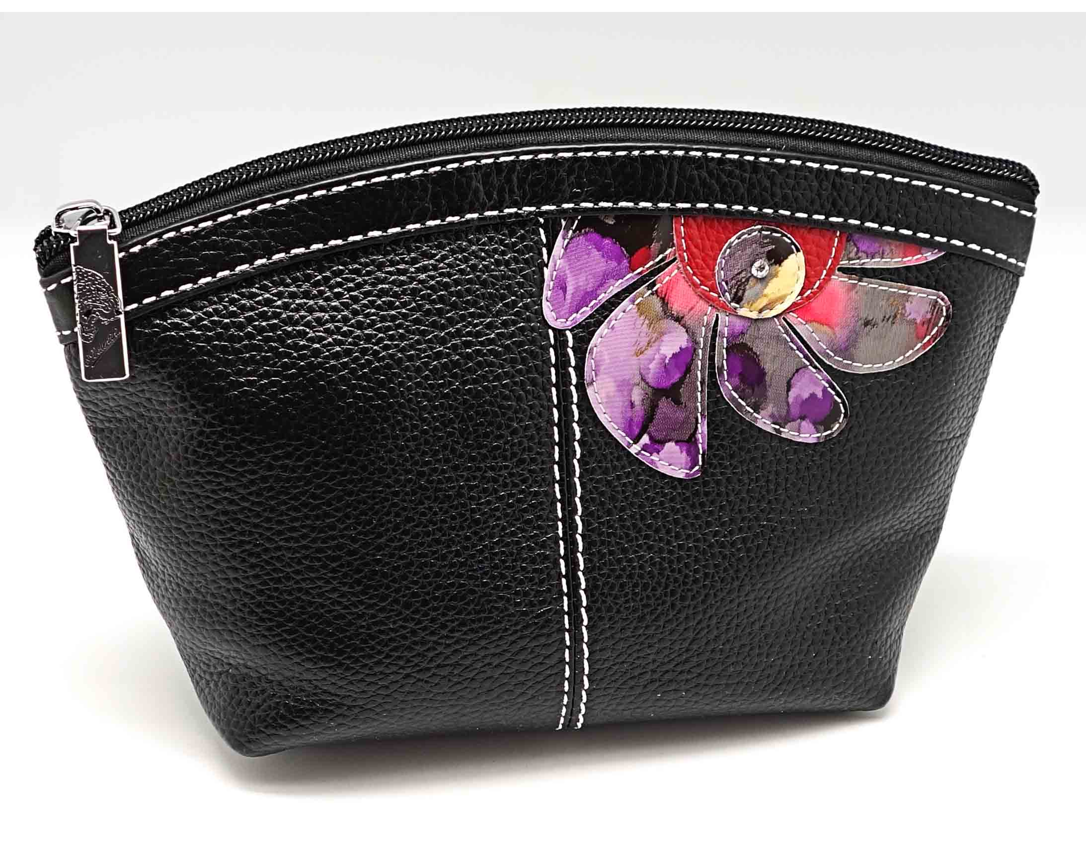 Размер 22 х 13 х 6,5 см. Закрывается на молнию. Внутри одно отделение, два кармашка- открытый и на молнии. Ограниченная серия аксессуаров, изготовленных из мягкой натуральной кожи и декорированных аппликацией. При производстве этой косметички использована значительная доля ручного труда.