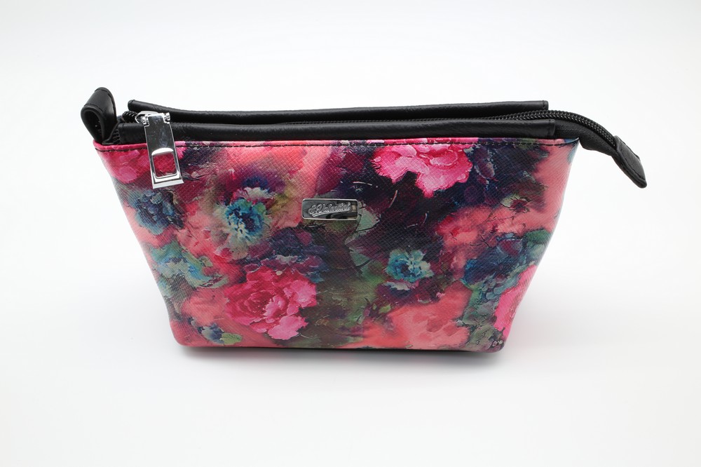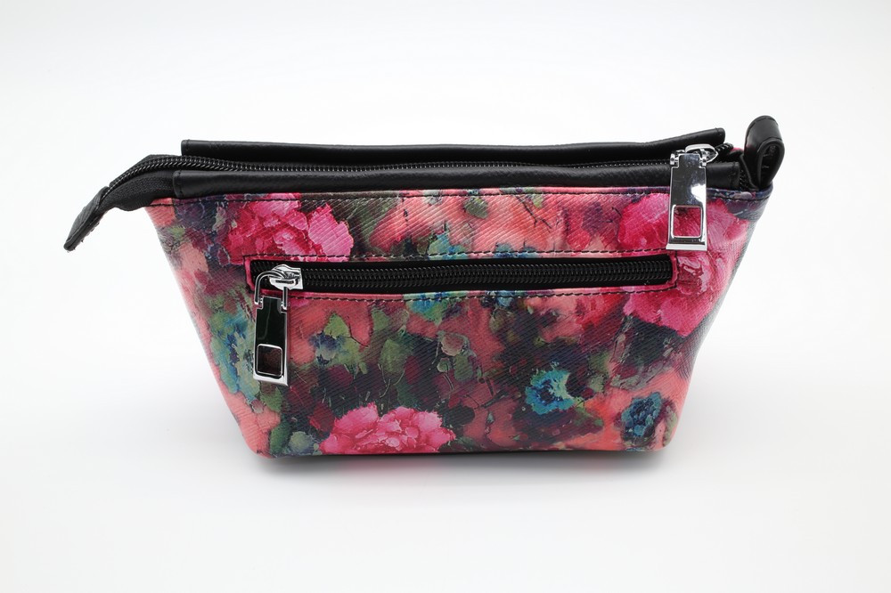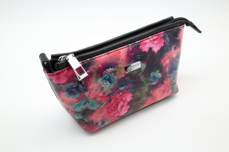 Размер 23 х 12 х 8 см. Закрывается на молнию. Внутри одно отделение и шесть боковых кармашков на подкладке. Снаружи, на тыльной стороне, карман на молнии.