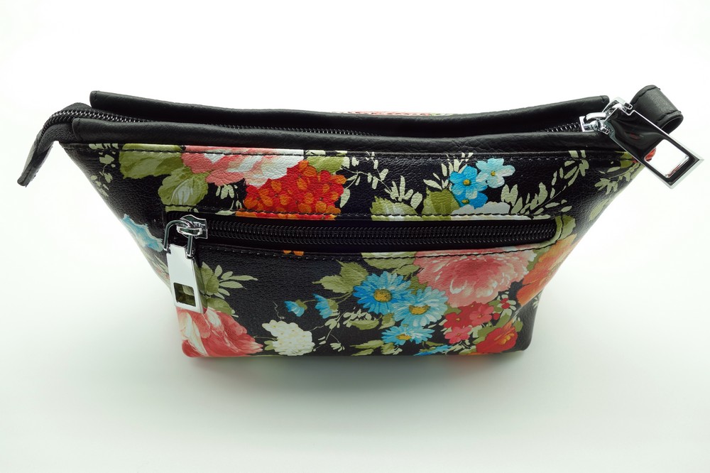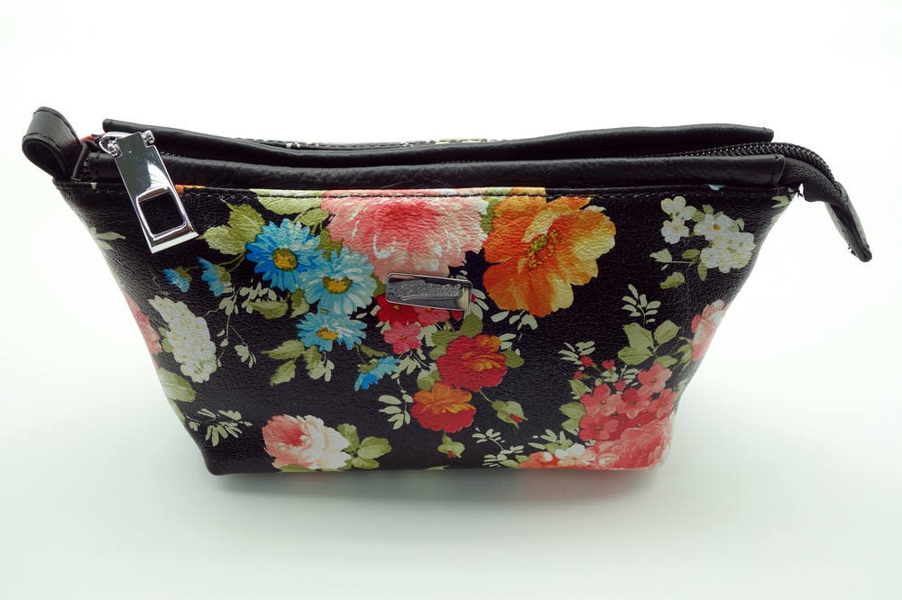 Размер 23 х 12 х 8 см. Закрывается на молнию. Внутри одно отделение и шесть боковых кармашков на подкладке. Снаружи, на тыльной стороне, карман на молнии.