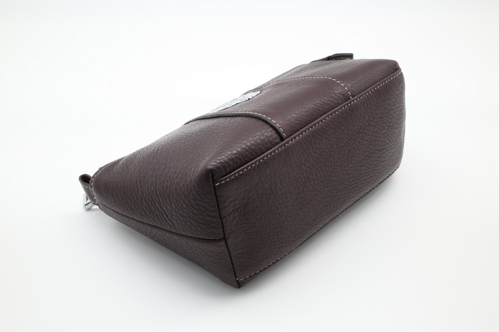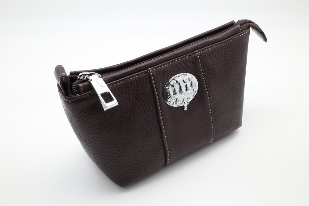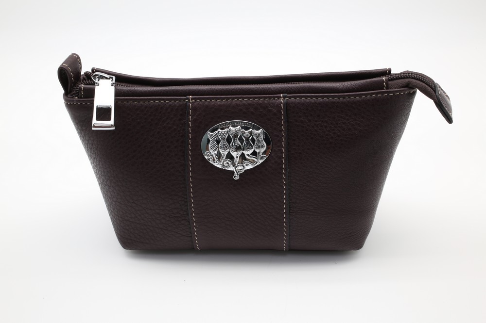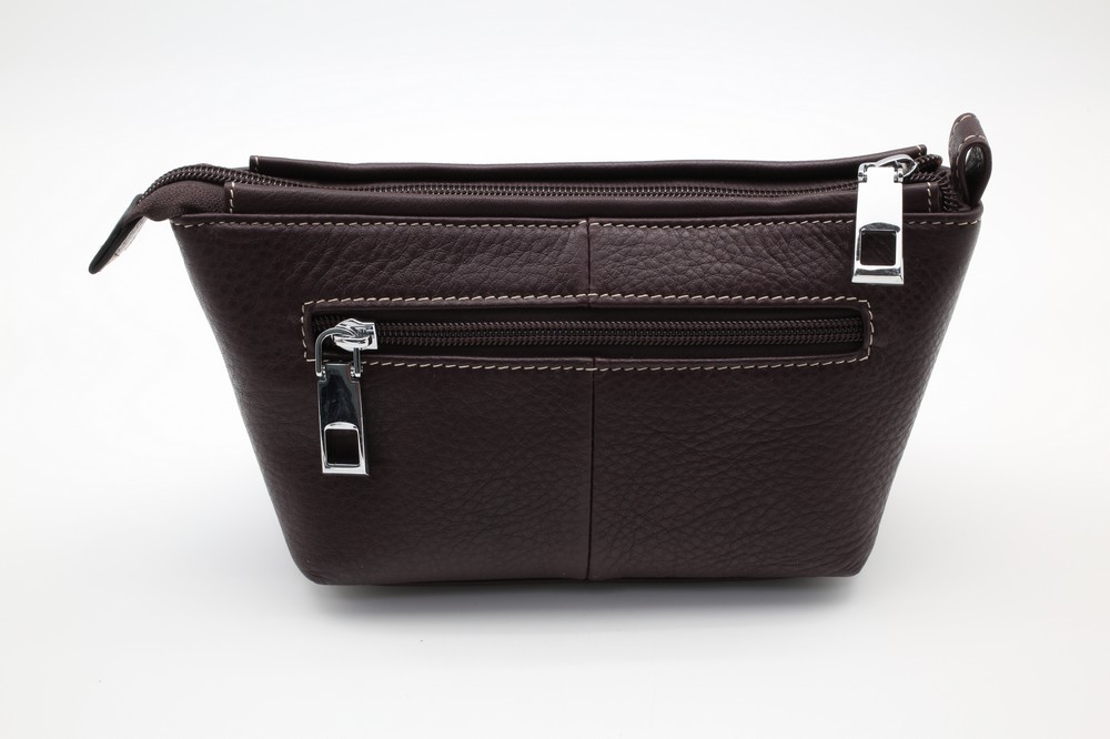 Размер 23 х 12 х 8 см. Закрывается на молнию. Внутри одно отделение и шесть боковых кармашков на подкладке. Снаружи, на тыльной стороне, карман на молнии.