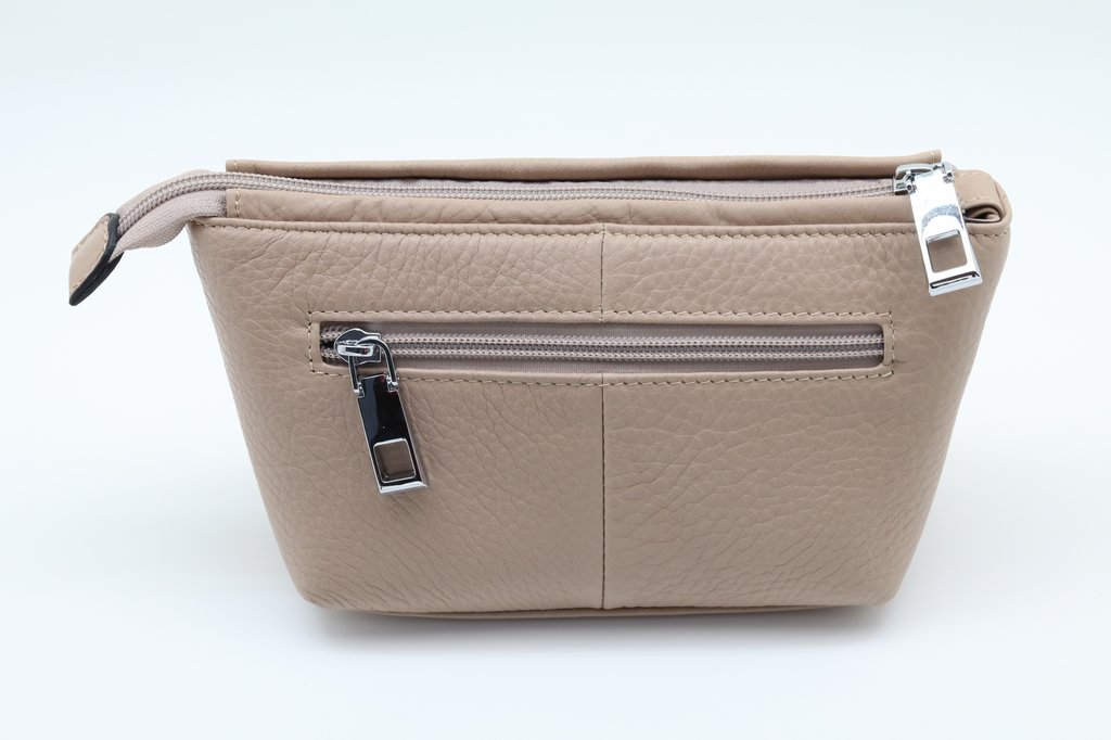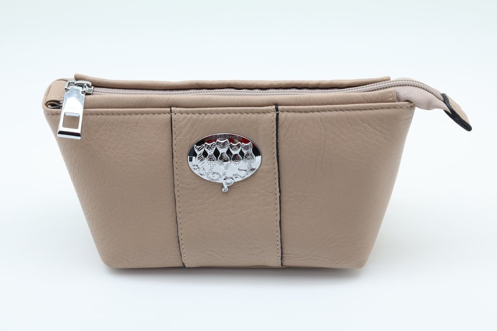 Размер 23 х 12 х 8 см. Закрывается на молнию. Внутри одно отделение и шесть боковых кармашков на подкладке. Снаружи, на тыльной стороне, карман на молнии.