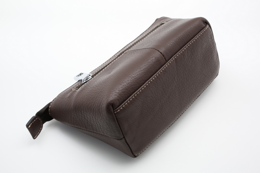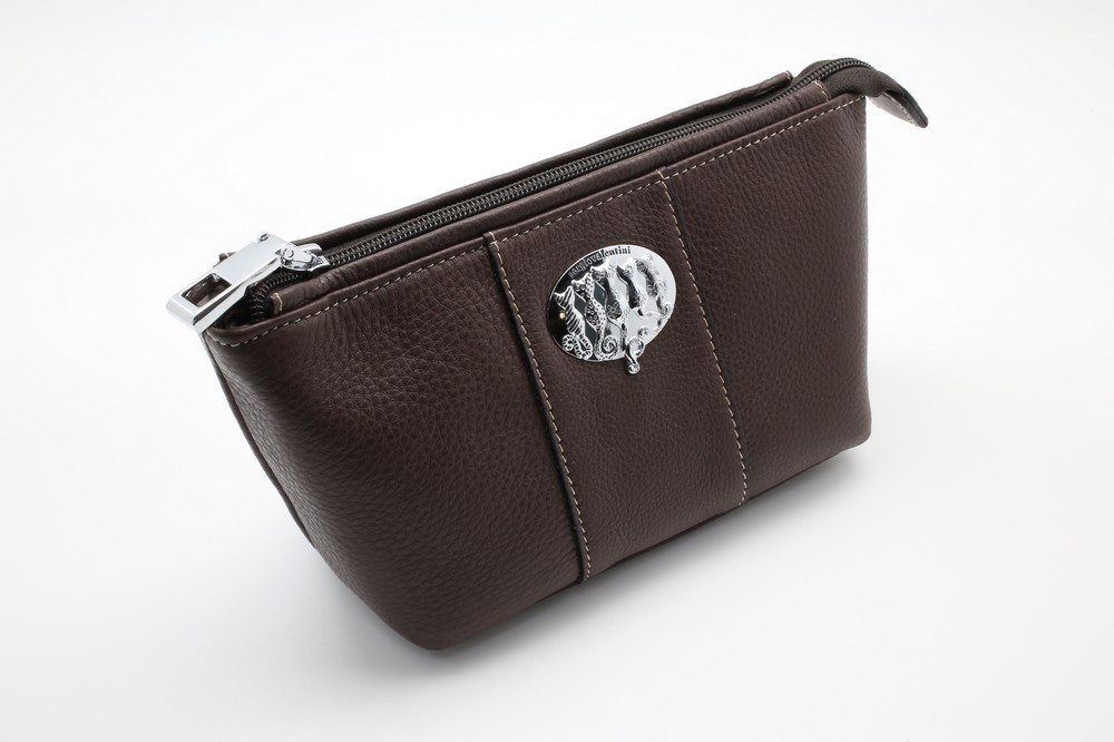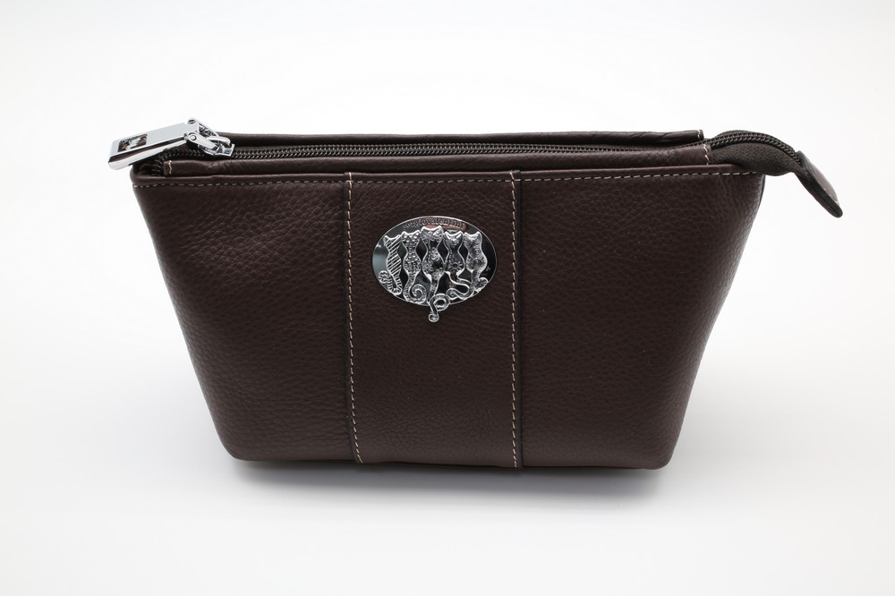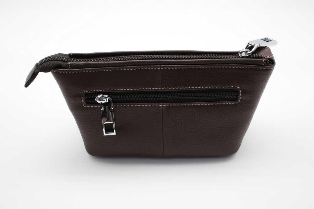 Размер 23 х 12 х 8 см. Закрывается на молнию. Внутри одно отделение и шесть боковых кармашков на подкладке. Снаружи, на тыльной стороне, карман на молнии.