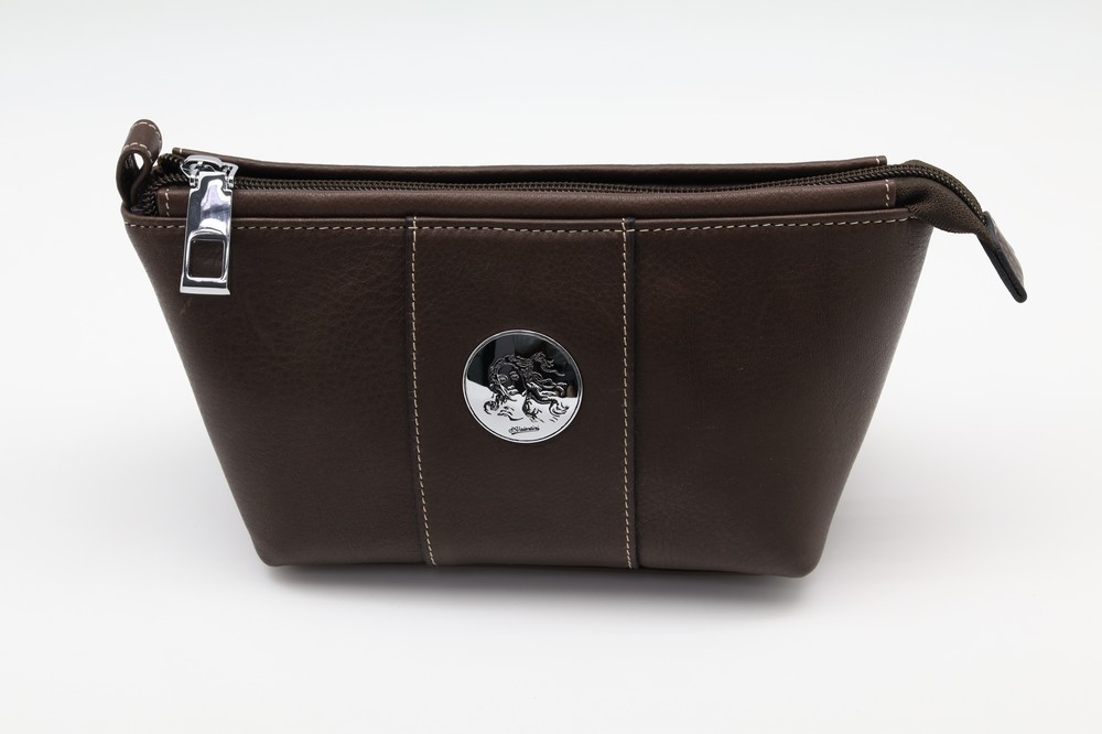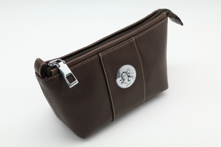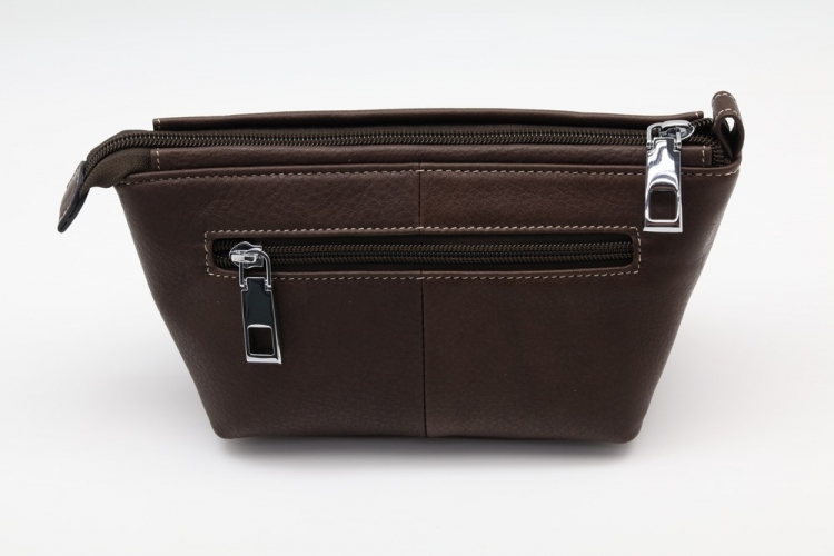 Размер 23 х 12 х 8 см. Закрывается на молнию. Внутри одно отделение и шесть боковых кармашков на подкладке. Снаружи, на тыльной стороне, карман на молнии.