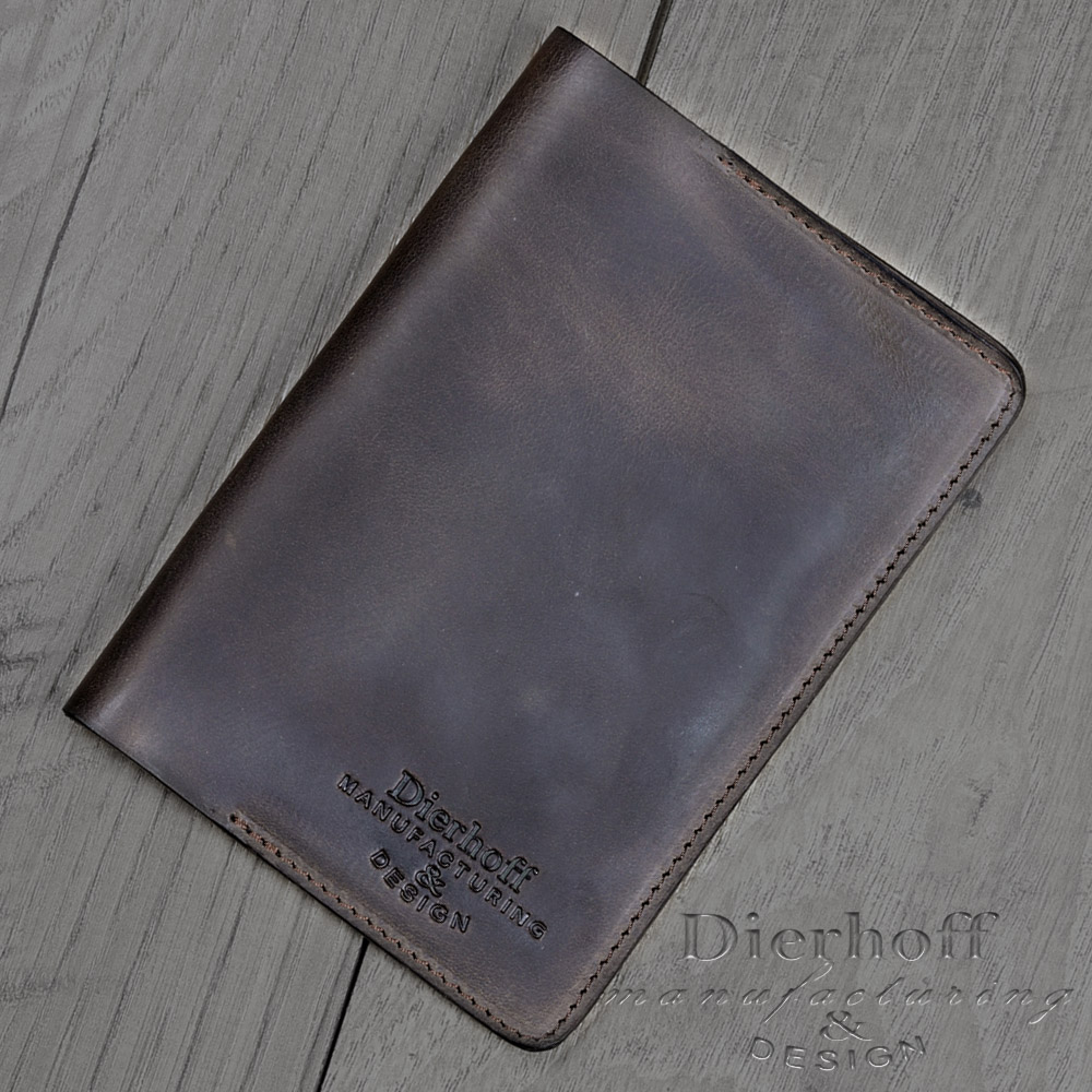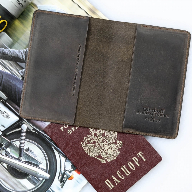 Размер 9,5 х 13,5 см. На внутренней стороне кожаные захваты. Обложка для паспорта функциональна и долговечна, изготовлена с использованием значительной доли ручного труда из высококачественной, плотной кожи "Крейзи Хорс", которая держит форму без картона или пластика, неприхотлива, надёжна. Пошарпанности и потертости, неизбежно возникающие при носке подобных изделий, только улучшают внешний вид, придают ему брутальную винтажность. Со временем в местах наибольшего трения цвет кожи может меняться на более насыщенный, даря изделию неповторимый шарм и ощущение благородной старины. Уникальность кожи Crazy Horse в том, что царапины легко удалить, для этого достаточно потереть дефект мягкой тряпочкой или пальцами и он исчезнет. Обложка упакована в подарочную коробку Dierhoff.