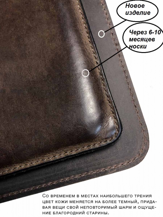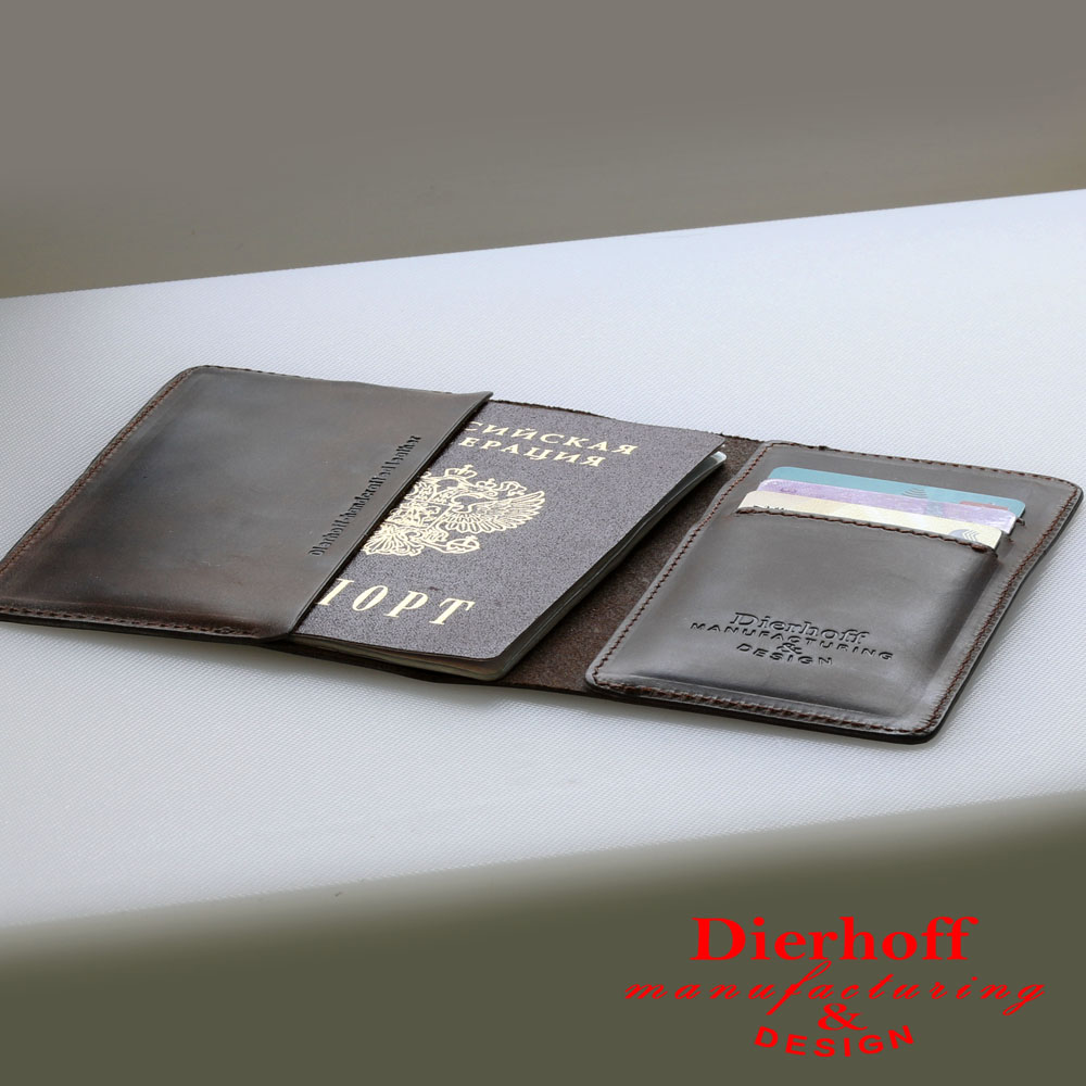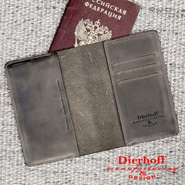 Размер 9,5 х 13,5 см. На внутренней стороне кожаные захваты, в правом находятся три кармашка для карточек. Обложка для паспорта функциональна и долговечна, изготовлена с использованием значительной доли ручного труда из высококачественной, плотной кожи "Крейзи Хорс", которая держит форму без картона или пластика, неприхотлива, надёжна. Пошарпанности и потертости, неизбежно возникающие при носке подобных изделий, только улучшают внешний вид, придают ему брутальную винтажность. Со временем в местах наибольшего трения цвет кожи может меняться на более насыщенный, даря изделию неповторимый шарм и ощущение благородной старины. Уникальность кожи Crazy Horse в том, что царапины легко удалить, для этого достаточно потереть дефект мягкой тряпочкой или пальцами и он исчезнет. Обложка упакована в подарочную коробку Dierhoff.