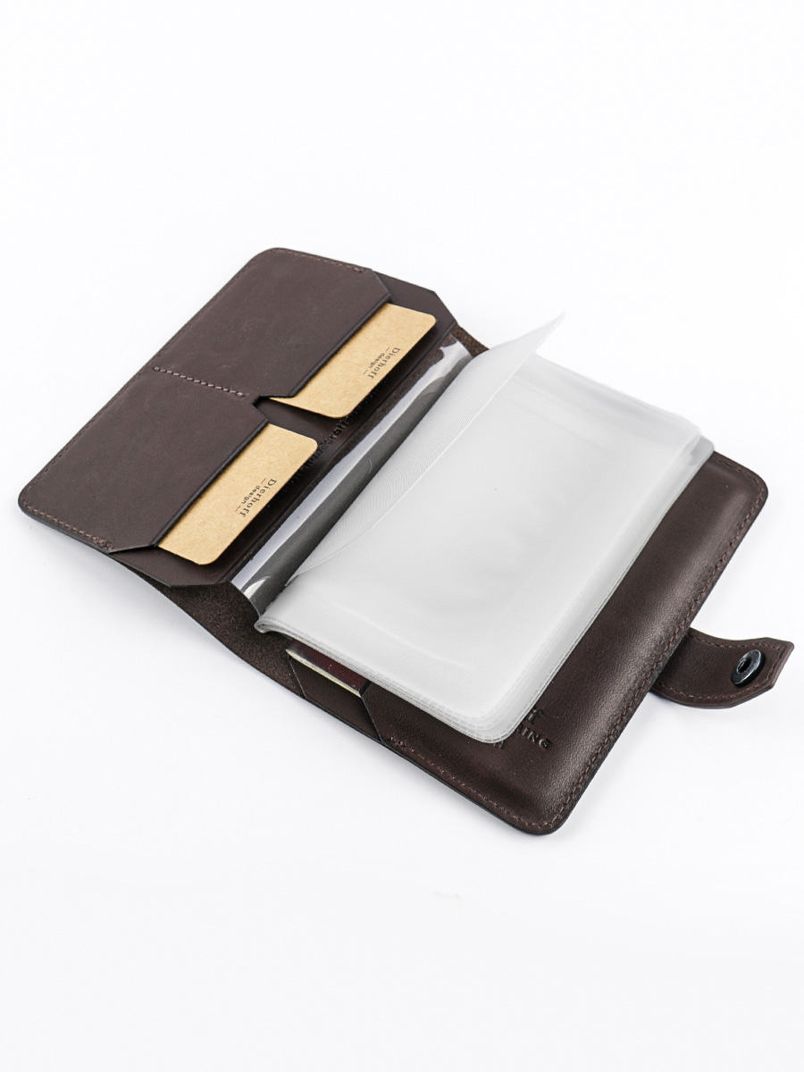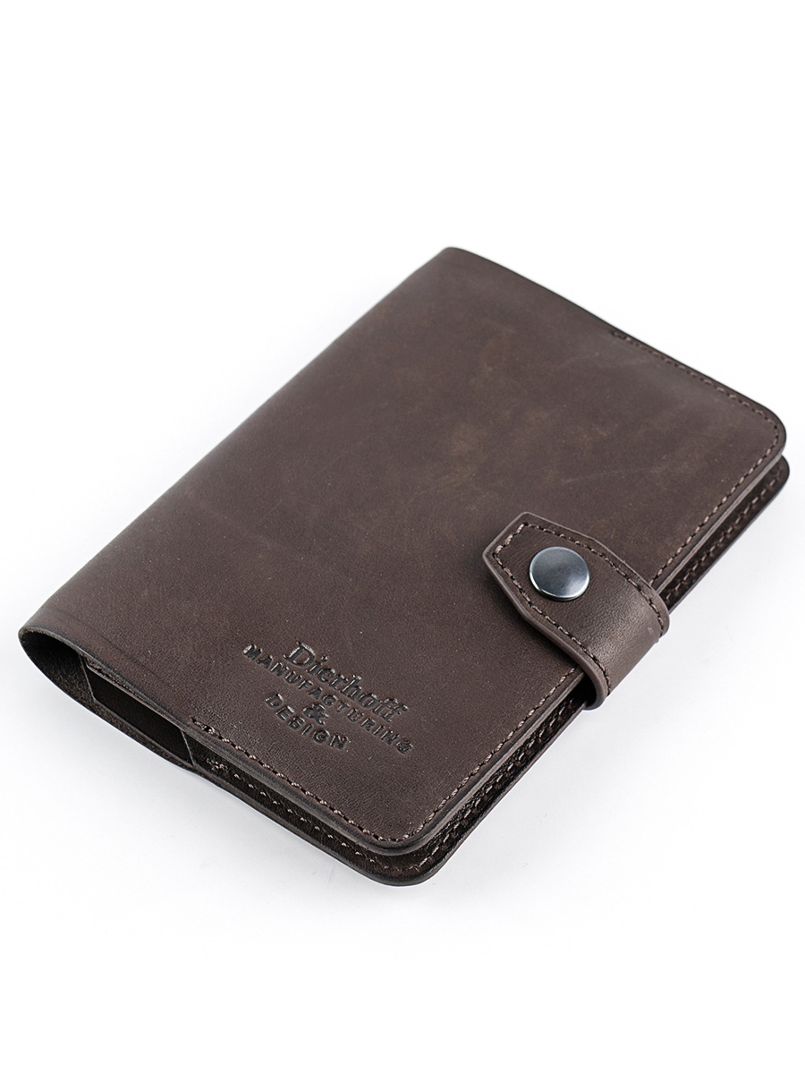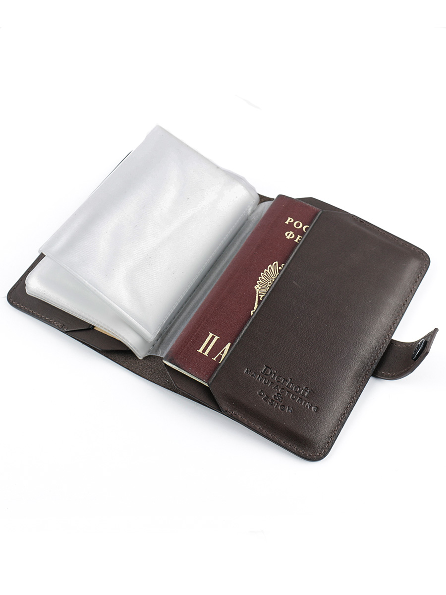 Размер 9,5 х 13,5 см. Обложка для паспорта и авто документов. Закрывается на хлястик с кнопкой. Внутри: слева - кожаный захват и два кармашка для карточек, справа- кожаный захват и карман, вкладыш с прозрачными файлами для авто документов. Обложка функциональна и долговечна, изготовлена с использованием значительной доли ручного труда. Высококачественная плотная кожа держит форму без картона или пластика, неприхотлива, надёжна. Обложка упакована в подарочную коробку Dierhoff.