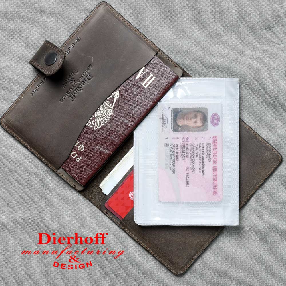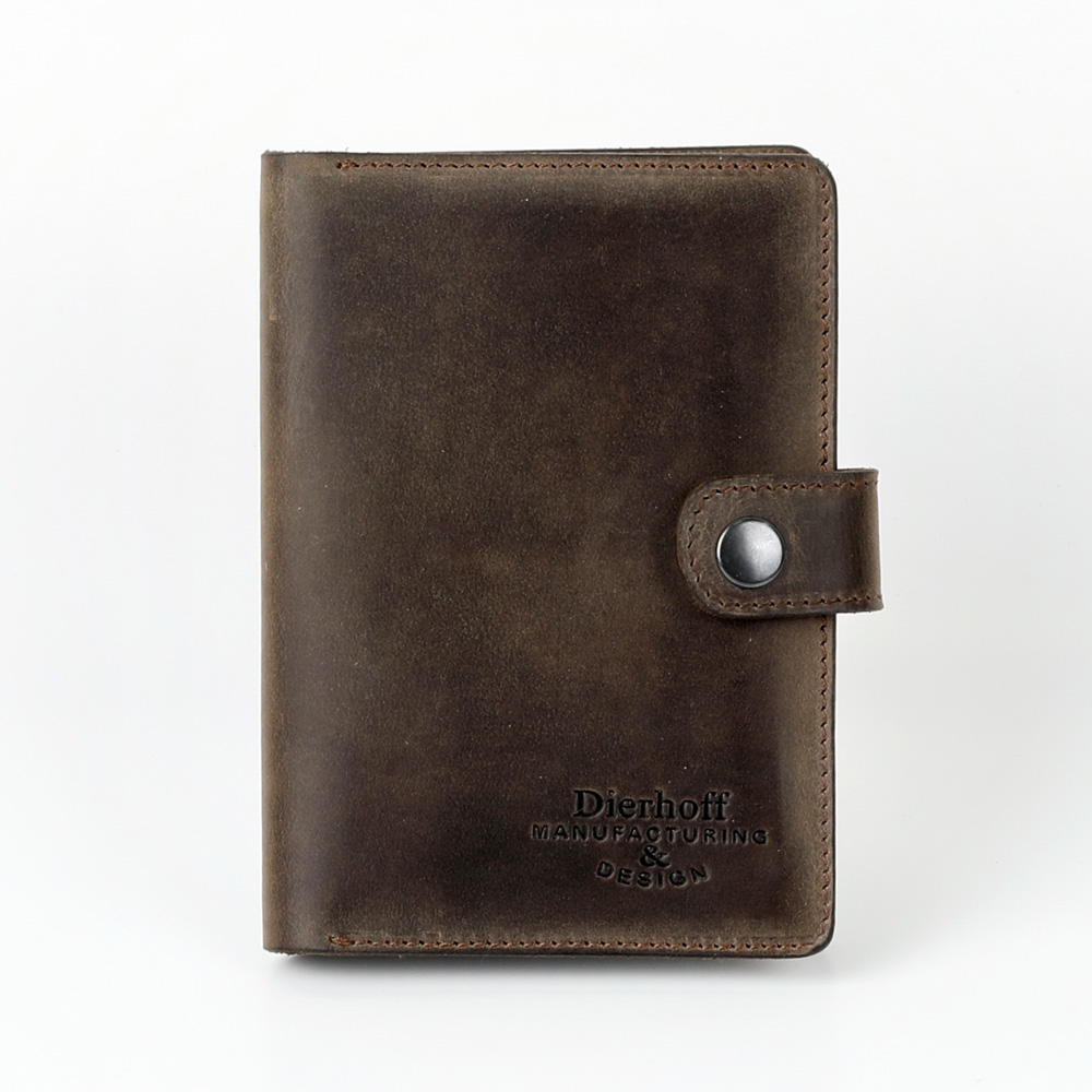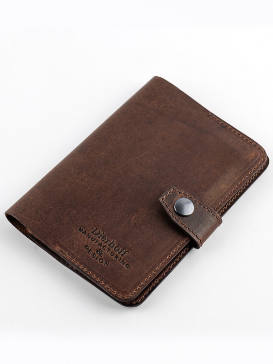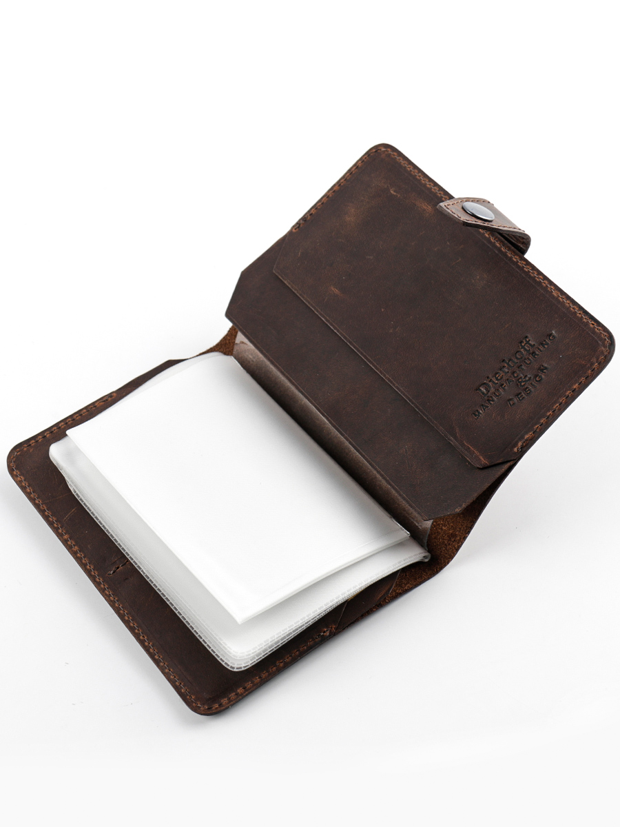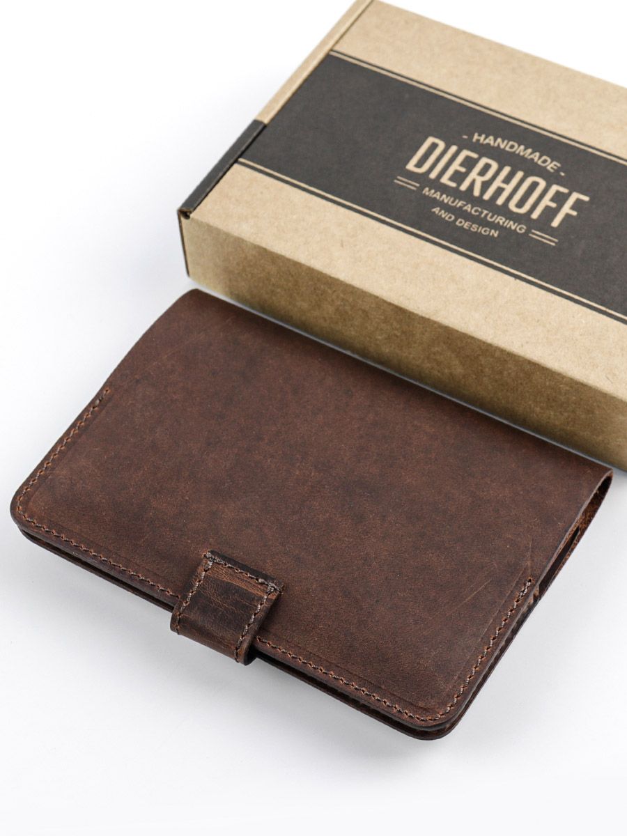 Размер 9,5 х 13,5 см. Обложка для паспорта и авто документов. Закрывается на хлястик с кнопкой. Внутри: слева - кожаный захват и два кармашка для карточек, справа- кожаный захват и карман, вкладыш с прозрачными файлами для авто документов. Обложка функциональна и долговечна, изготовлена с использованием значительной доли ручного труда из высококачественной, плотной кожи "Крейзи Хорс", которая держит форму без картона или пластика, неприхотлива, надёжна. Потертости, неизбежно возникающие при носке подобных изделий, только улучшают внешний вид, придают ему брутальную винтажность. Со временем в местах наибольшего трения цвет кожи может меняться на более насыщенный, даря изделию неповторимый шарм и ощущение благородной старины. Уникальность кожи Crazy Horse в том, что царапины легко удалить, для этого достаточно потереть дефект мягкой тряпочкой или пальцами и он исчезнет. Обложка упакована в подарочную коробку Dierhoff.