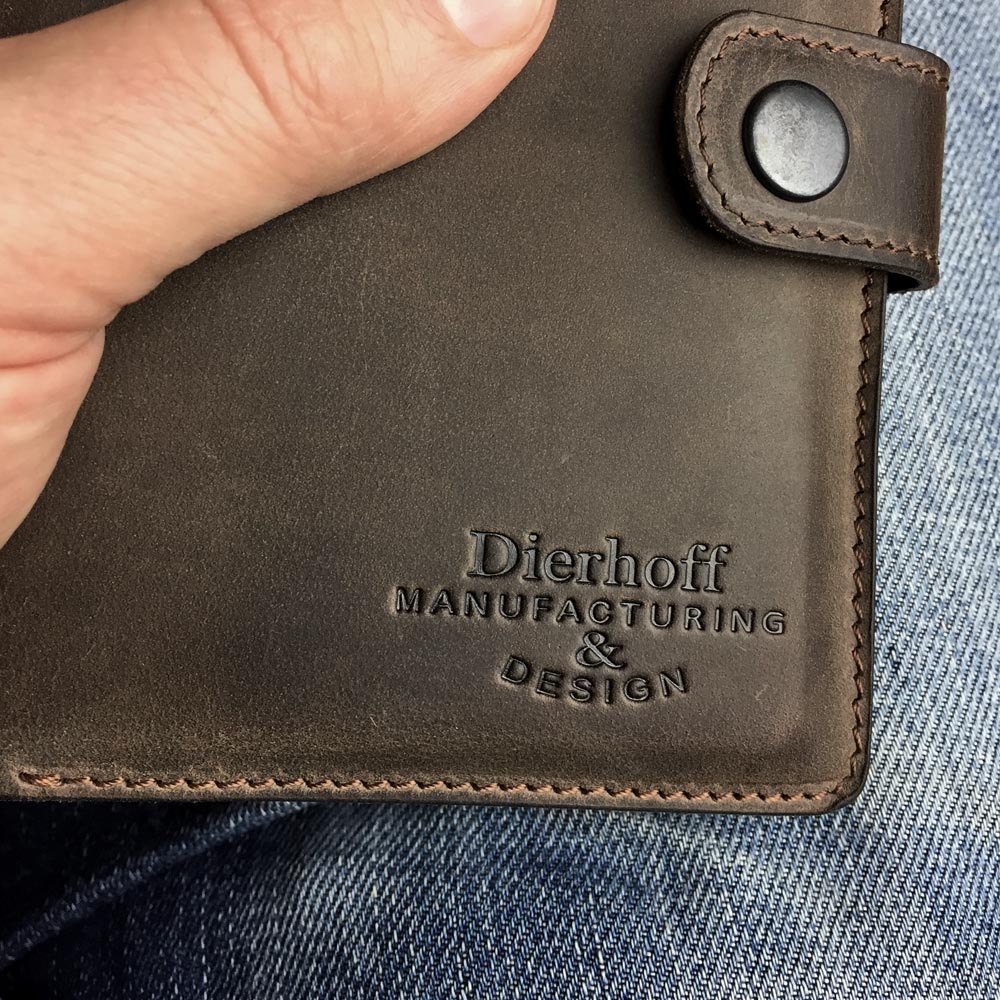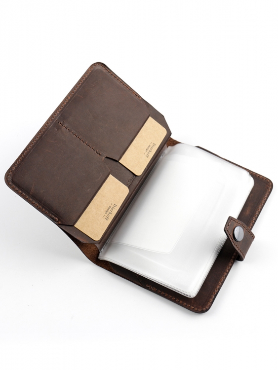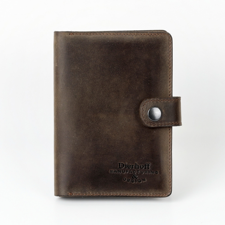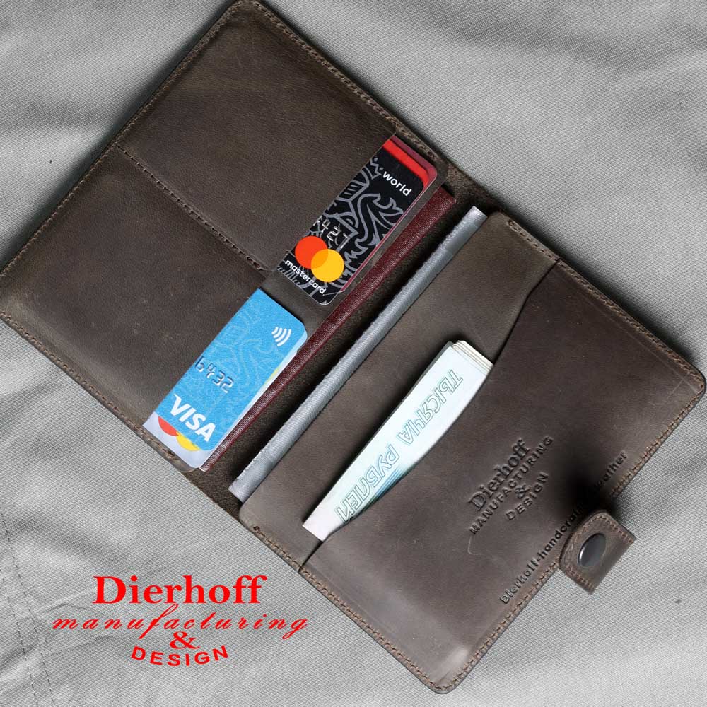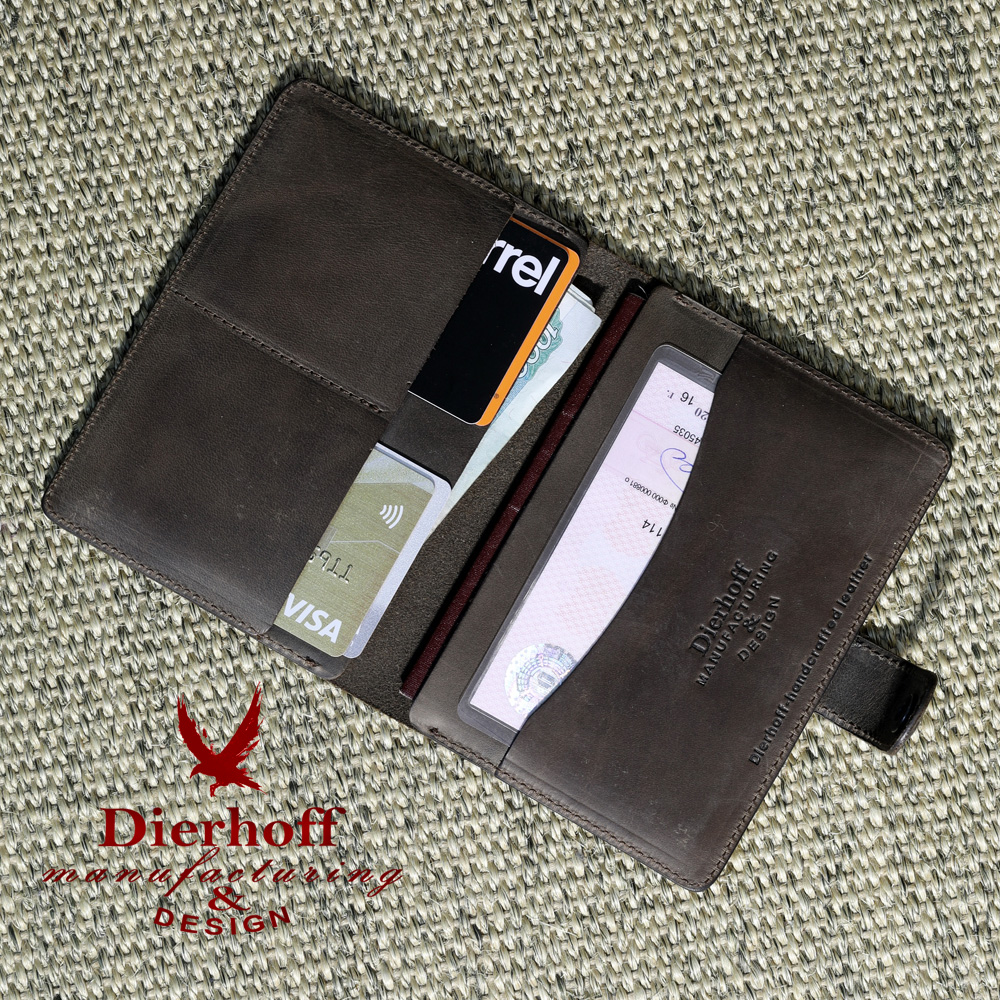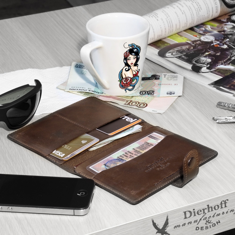 Размер 9,5 х 13,5 см. Обложка для паспорта и авто документов. Закрывается на хлястик с кнопкой. Внутри: слева - кожаный захват и два кармашка для карточек, справа- кожаный захват и карман, вкладыш с прозрачными файлами для авто документов. Обложка функциональна и долговечна, изготовлена с использованием значительной доли ручного труда из высококачественной, плотной кожи "Крейзи Хорс", которая держит форму без картона или пластика, неприхотлива, надёжна. Потертости, неизбежно возникающие при носке подобных изделий, только улучшают внешний вид, придают ему брутальную винтажность. Со временем в местах наибольшего трения цвет кожи может меняться на более насыщенный, даря изделию неповторимый шарм и ощущение благородной старины. Уникальность кожи Crazy Horse в том, что царапины легко удалить, для этого достаточно потереть дефект мягкой тряпочкой или пальцами и он исчезнет. Обложка упакована в подарочную коробку Dierhoff.