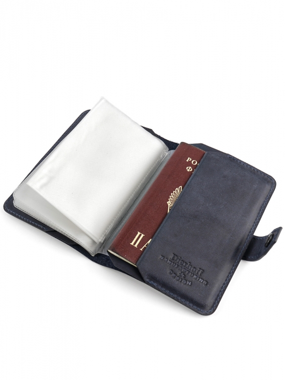 Размер 9,5 х 13,5 см. Обложка для паспорта и авто документов. Закрывается на хлястик с кнопкой. Внутри: слева - кожаный захват и два кармашка для карточек, справа- кожаный захват и карман, вкладыш с прозрачными файлами для авто документов. Обложка функциональна и долговечна, изготовлена с использованием значительной доли ручного труда из высококачественной, плотной кожи "Крейзи Хорс", которая держит форму без картона или пластика, неприхотлива, надёжна. Потертости, неизбежно возникающие при носке подобных изделий, только улучшают внешний вид, придают ему брутальную винтажность. Со временем в местах наибольшего трения цвет кожи может меняться на более насыщенный, даря изделию неповторимый шарм и ощущение благородной старины. Уникальность кожи Crazy Horse в том, что царапины легко удалить, для этого достаточно потереть дефект мягкой тряпочкой или пальцами и он исчезнет. Обложка упакована в подарочную коробку Dierhoff.