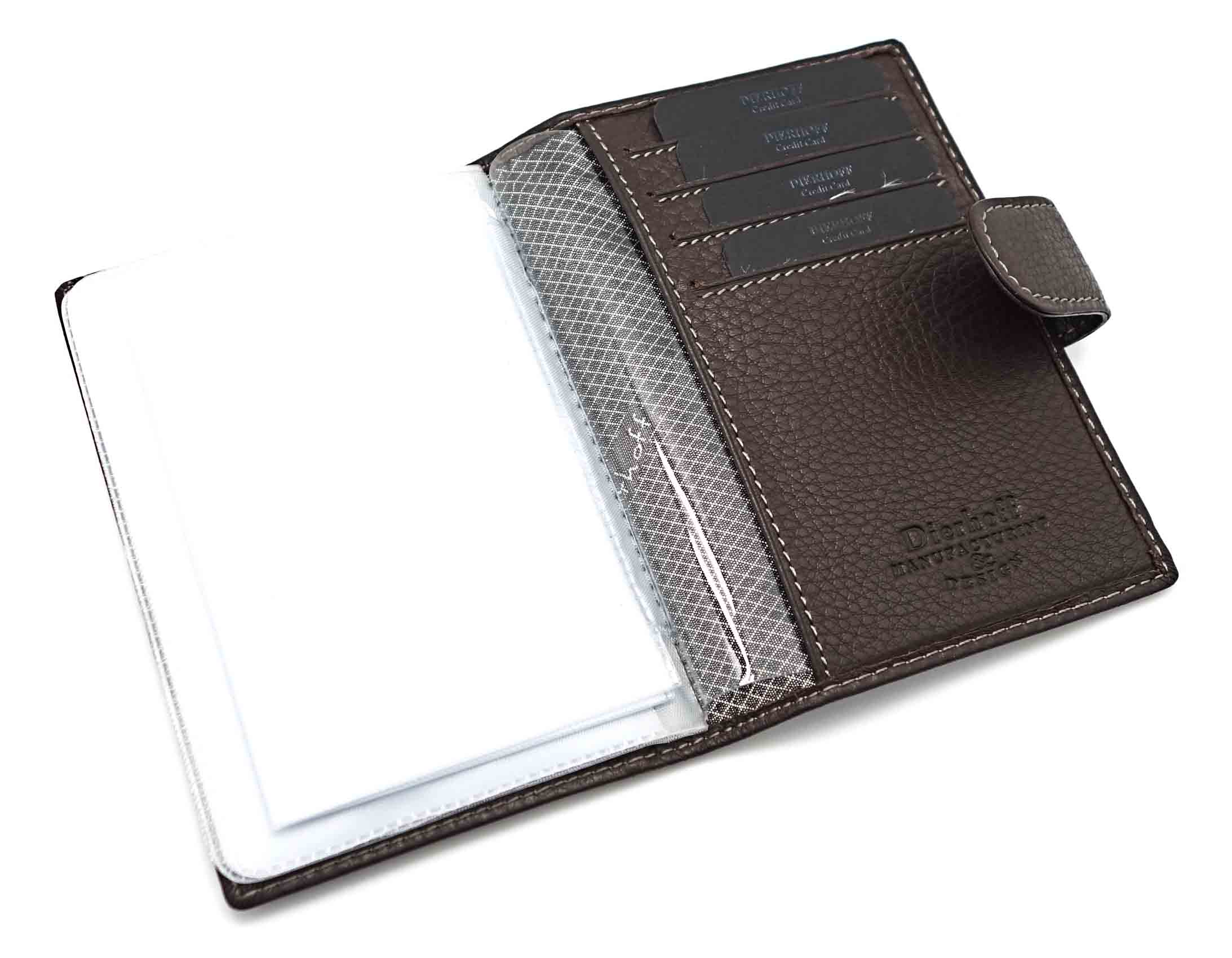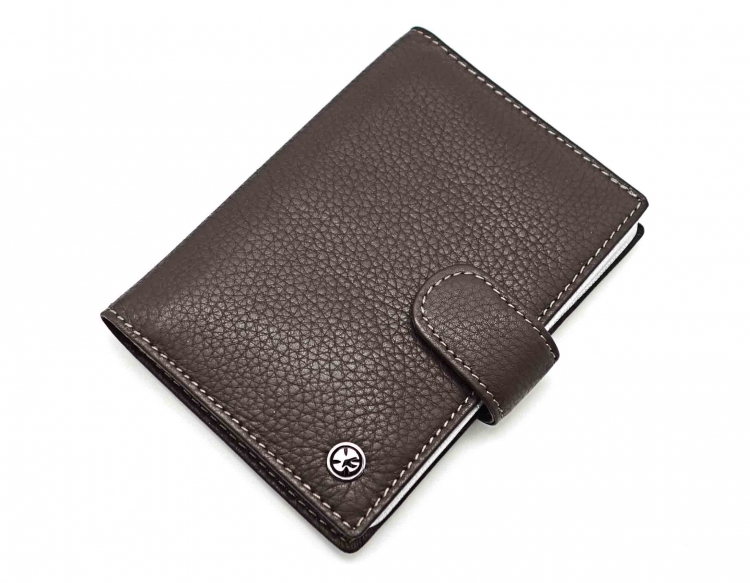 Обложка для автодокументов. Размер: 9,5 х 13 см. Закрывается на хлястик с кнопкой. Внутри: слева - прозрачный захват и текстильная подкладка, справа- кожаный захват с четырьмя кармашками для пластиковых карт, вкладыш с прозрачными файлами для автодокументов.