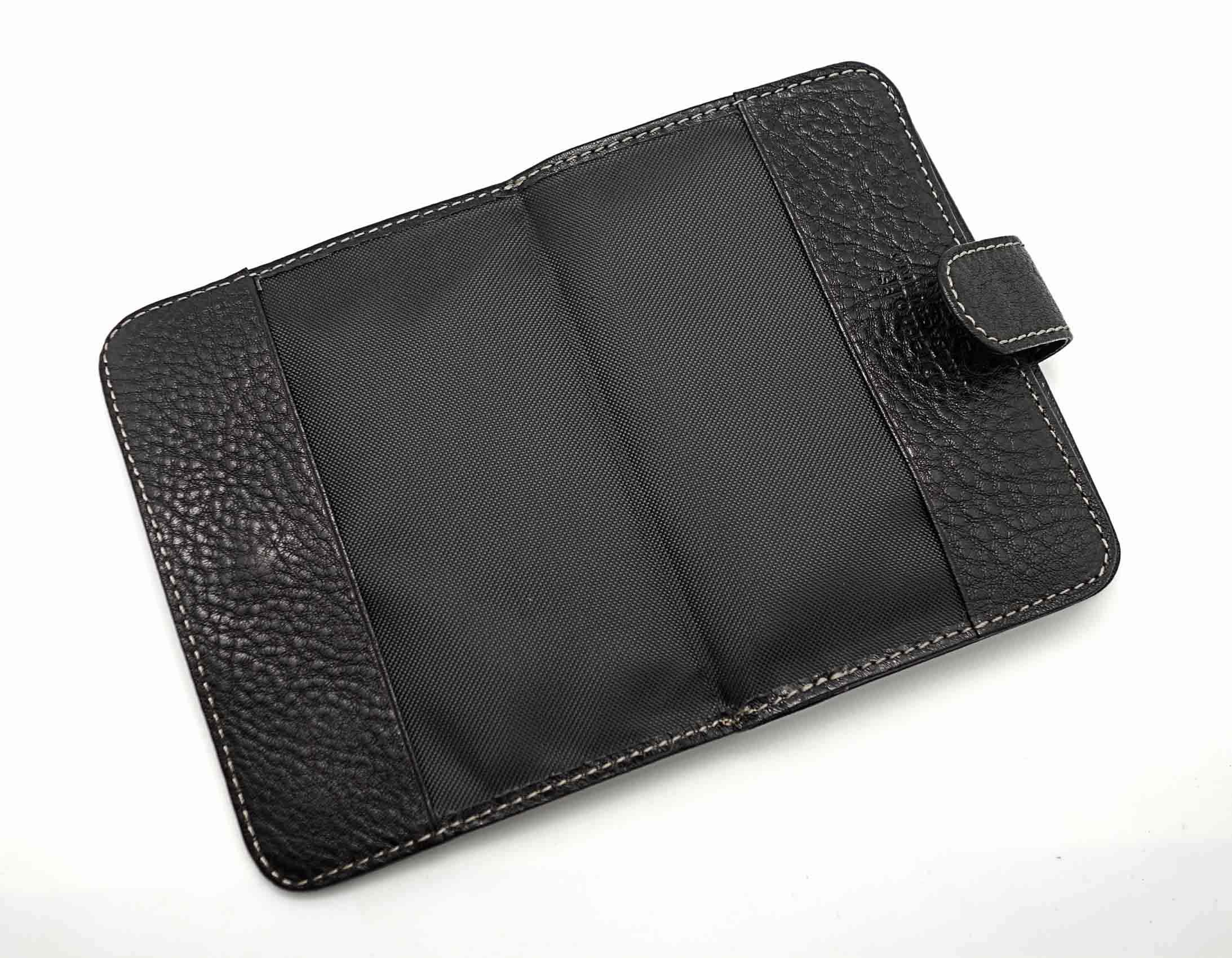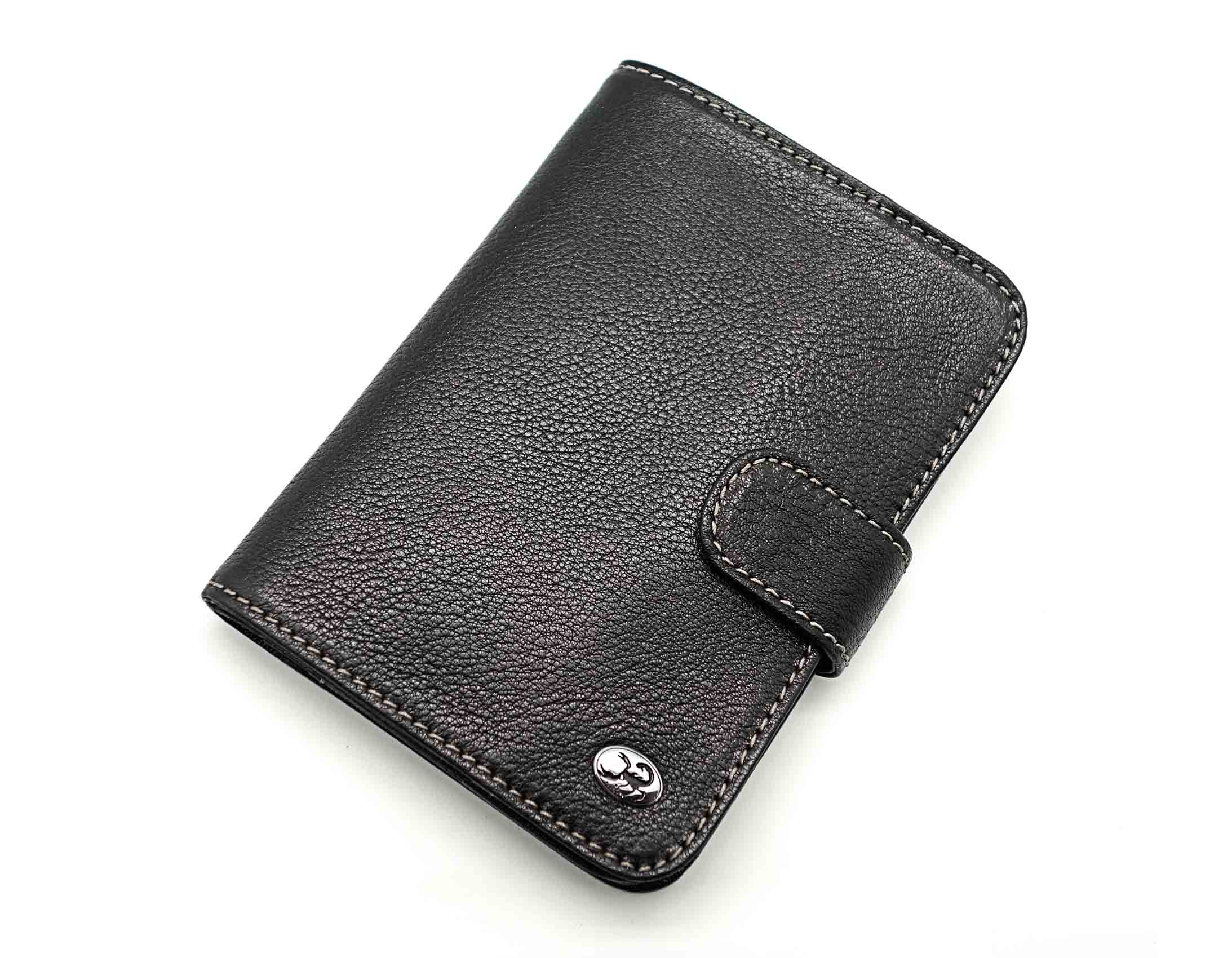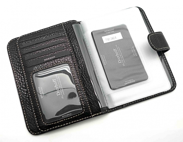 Размер 10 х13,5 см. Закрывается на хлястик с кнопкой. Внутри: отделение для паспорта, отделение с прозрачным вкладышем для автодокументов, на центральной створке: четыре кармашка для пластиковых карт, прозрачный карман для фотографии и один боковой карман.