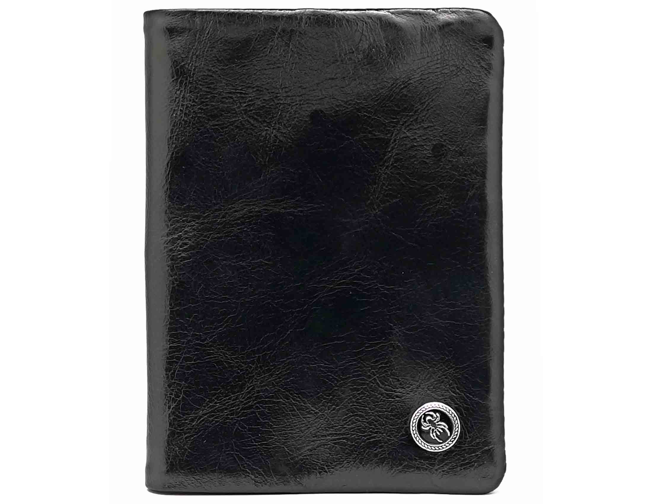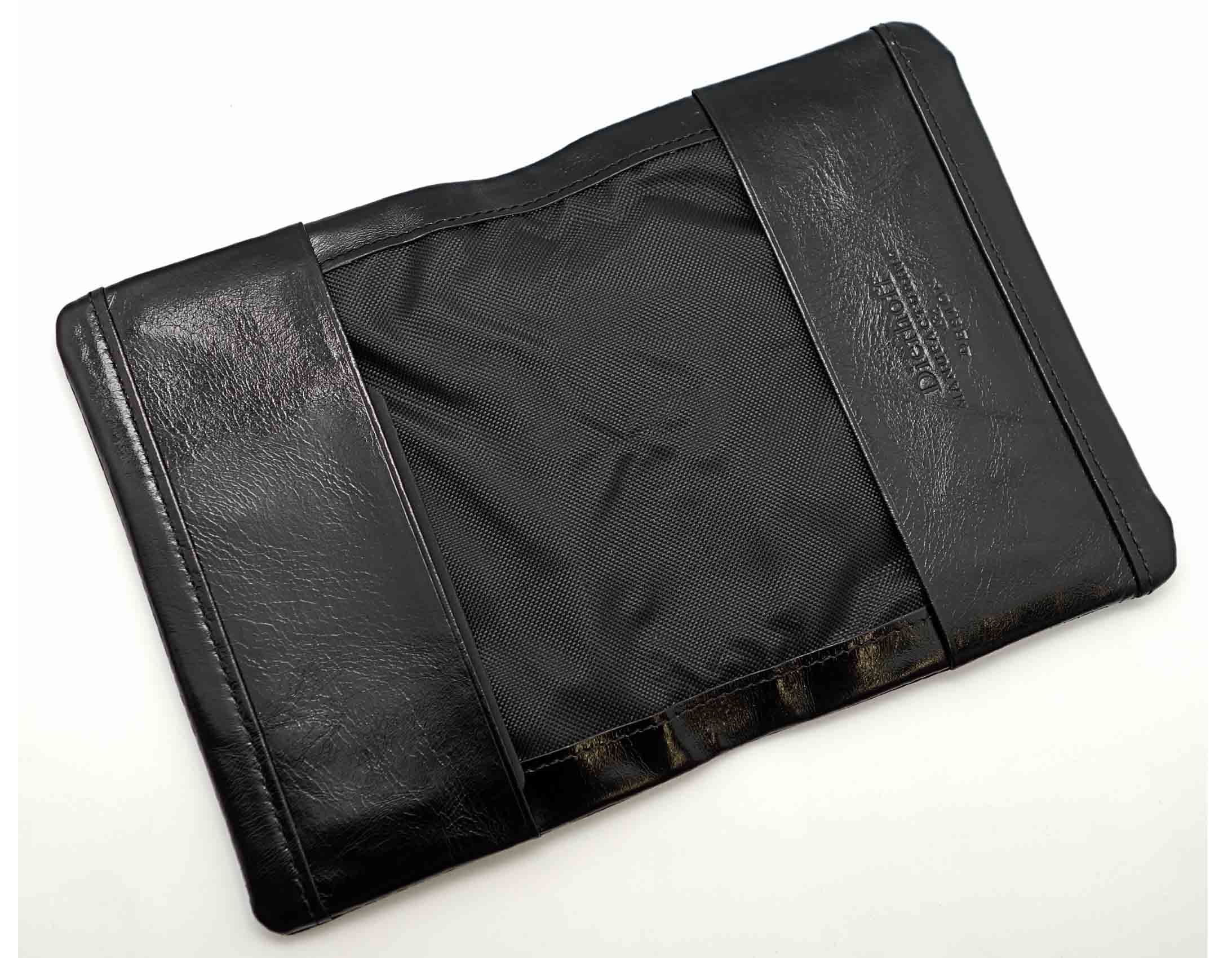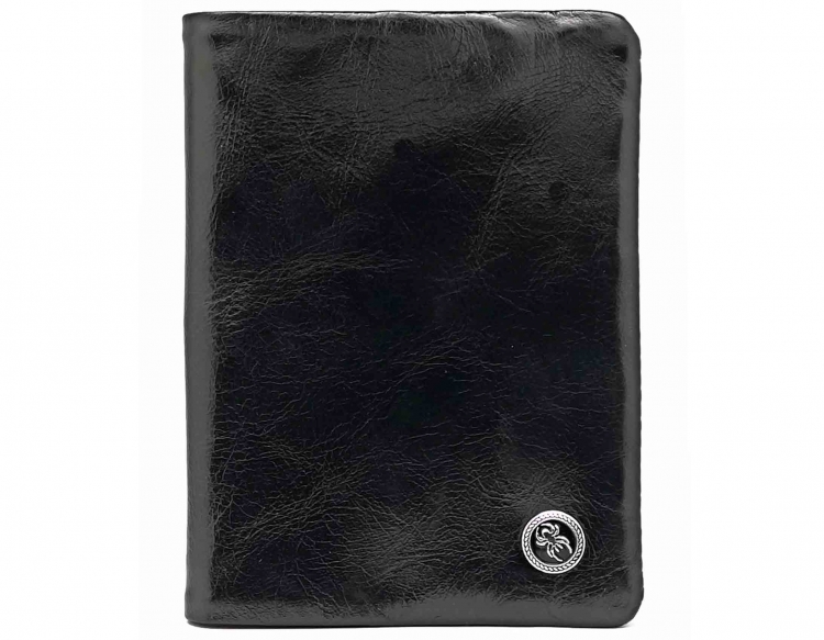 Размер: 9,5 х13 см. На внутренней стороне обложки текстильная подкладка с логотипом и кожаные захваты.