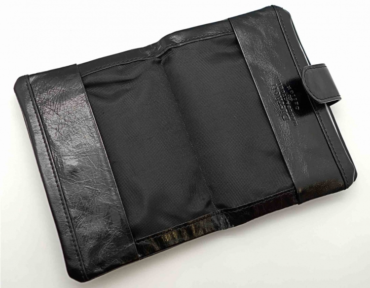 Размер 9,5 х13,5 см. Закрывается на хлястик с кнопкой. Внутри: отделение для паспорта, отделение с прозрачным вкладышем для автодокументов, на центральной створке: четыре кармашка для пластиковых карт и прозрачный карман для фотографии.