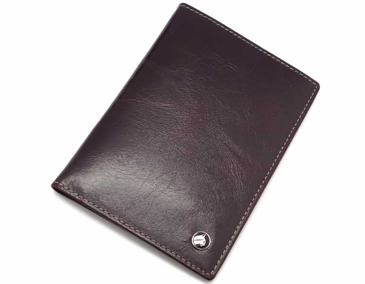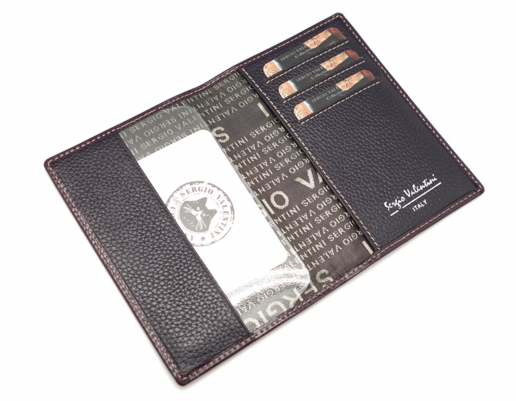 Размер 9,5 х 13,5 см. На внутренней стороне обложки слева- прозрачный захват и кожаный кармашек, справа- кожаный захват с тремя кармашками для карточек.