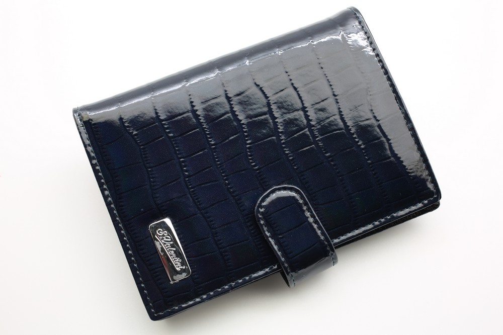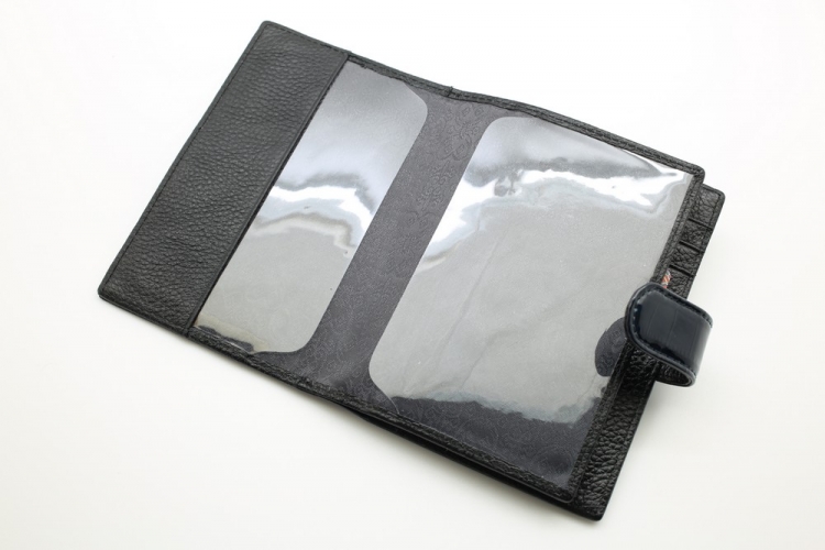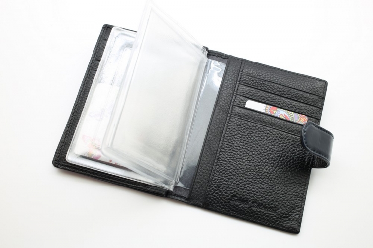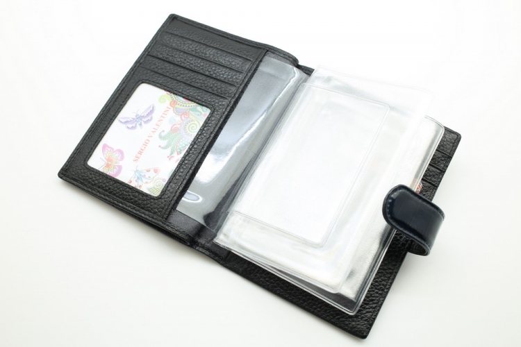 Размер 10 х 13,5 см.. Закрывается на хлястик с кнопкой. Внутри: отделение для паспорта, отделение с прозрачным вкладышем для автодокументов, на створке: четыре кармашка для пластиковых карт, прозрачный карман для фотографии и один боковой карман.