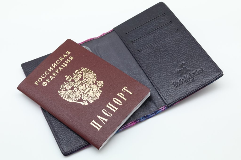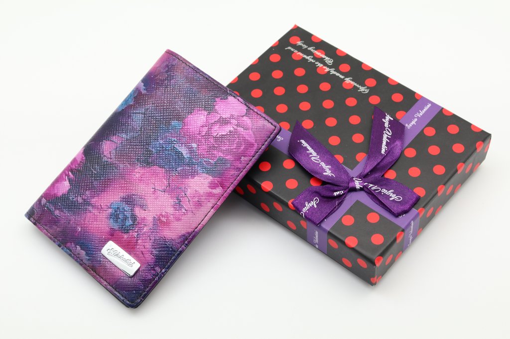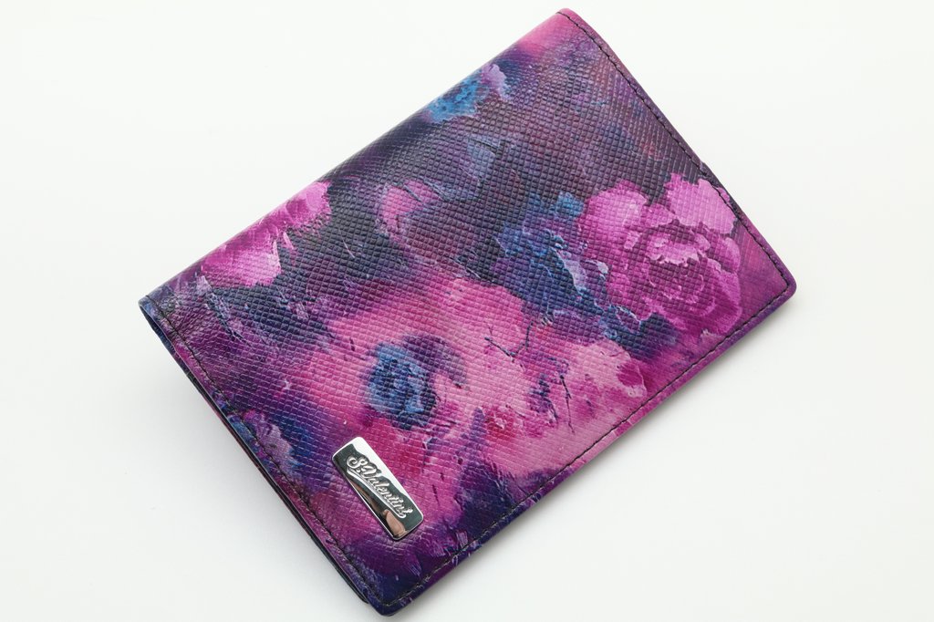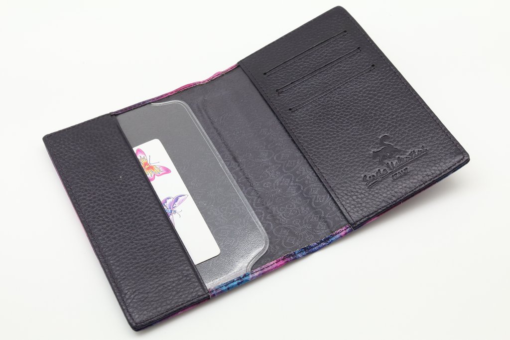 Размер 9,5 х 13,5 см. На внутренней стороне обложки прозрачный захват и кожаный кармашек с левой стороны, кожаный захват и три кармашка для карточек с правой стороны.