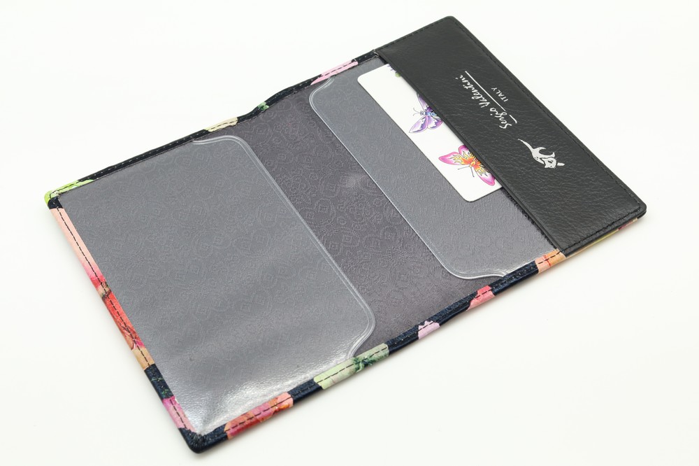 Размер 9,5 х 13,5 см. Внутри- прозрачные захваты и кожаный кармашек на правой створке.