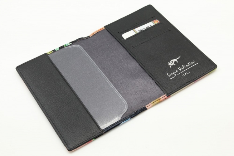 Размер 9,5 х 13,5 см. На внутренней стороне обложки прозрачный захват и кожаный кармашек с левой стороны, кожаный захват и три кармашка для карточек с правой стороны.