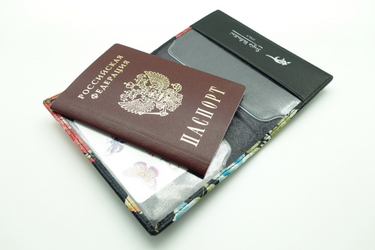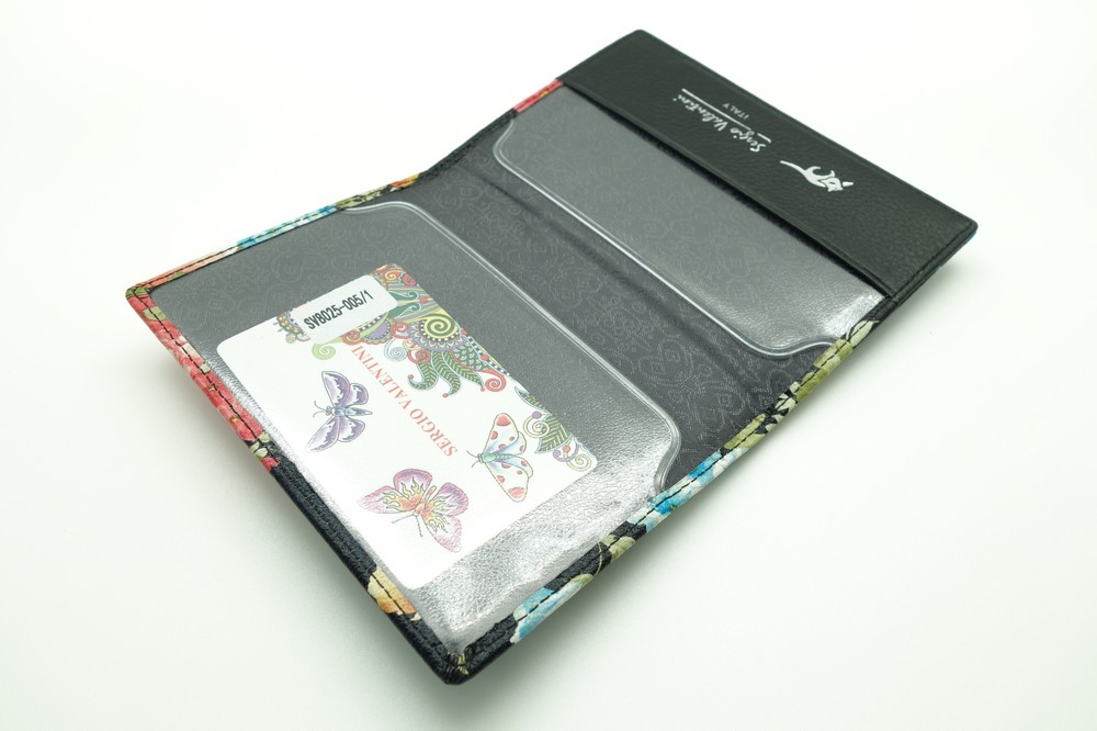 Размер 9,5 х 13,5 см. Внутри- прозрачные захваты и кожаный кармашек на правой створке.