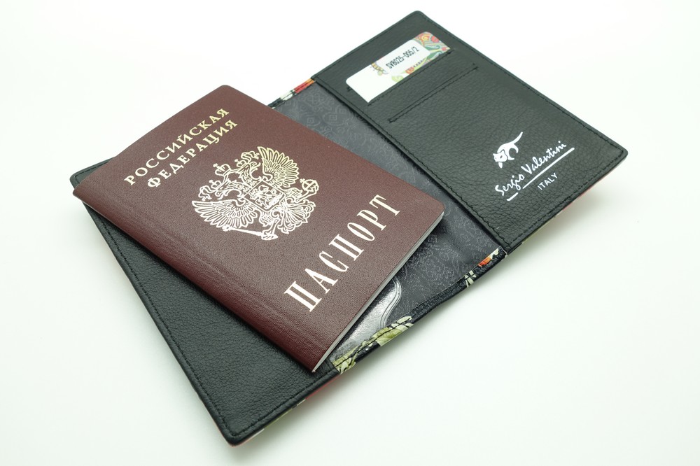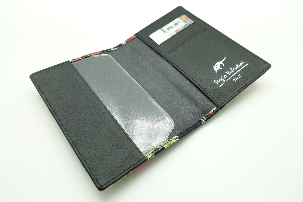 Размер 9,5 х 13,5 см. На внутренней стороне обложки прозрачный захват и кожаный кармашек с левой стороны, кожаный захват и три кармашка для карточек с правой стороны.