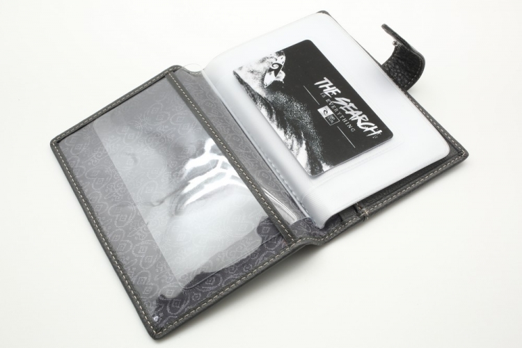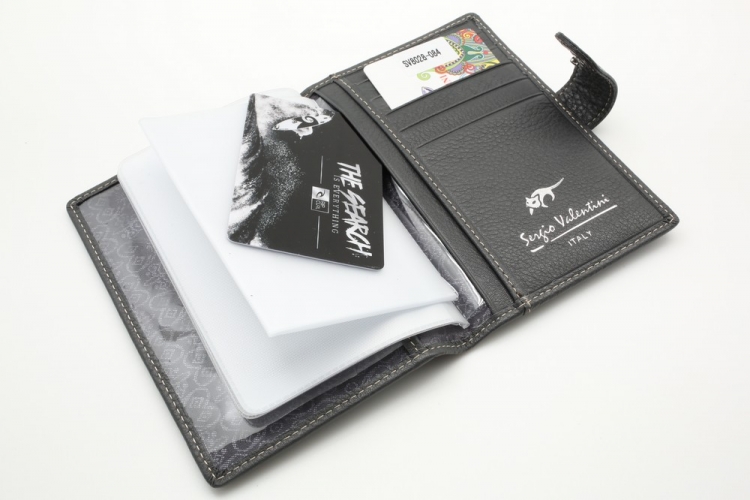 Обложка для автодокументов. Размер 10 х 13,5 см. Закрывается на хлястик с кнопкой. Внутри: слева - прозрачный захват и текстильная подкладка, справа- кожаный захват, продольный карман и четыре кармашка для пластиковых карт. Изделие укомплектовано вкладышем с прозрачными файлами для автодокументов.