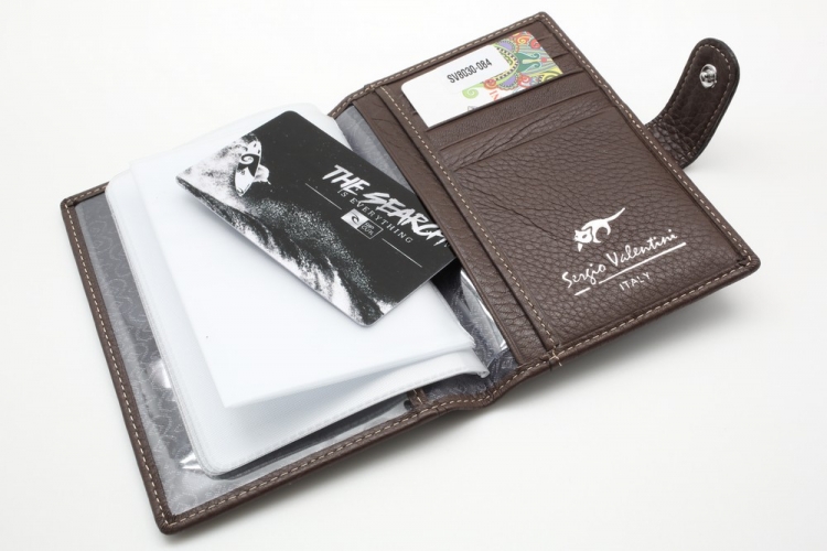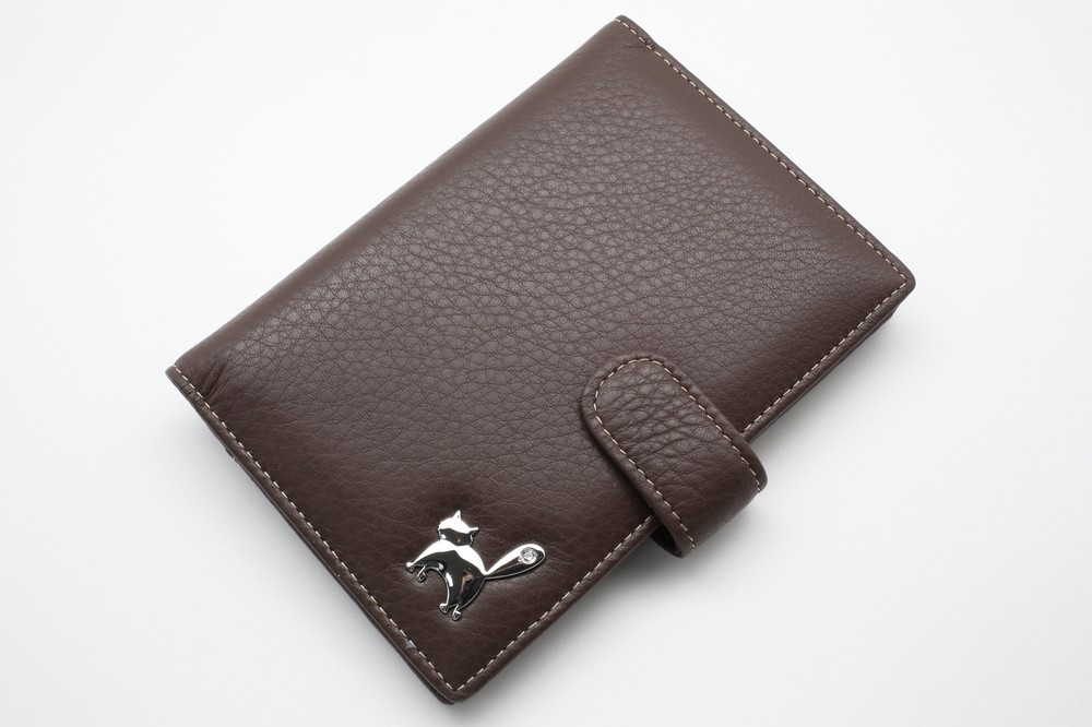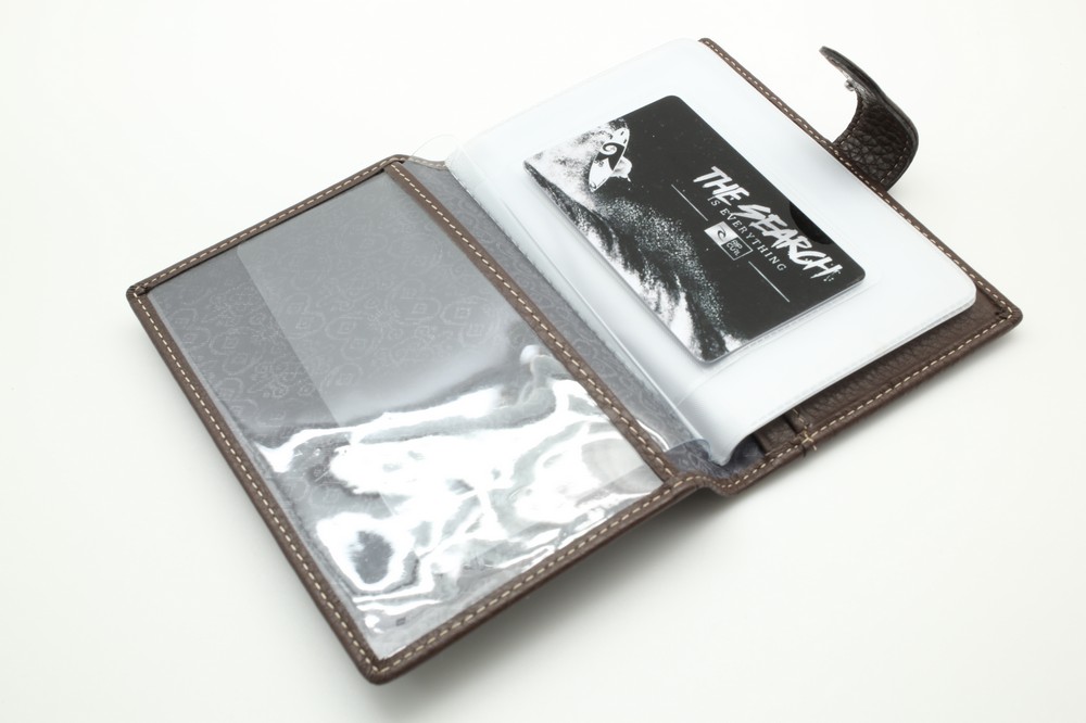 Обложка для автодокументов. Размер 10 х 13,5 см. Закрывается на хлястик с кнопкой. Внутри: слева - прозрачный захват и текстильная подкладка, справа- кожаный захват, продольный карман и четыре кармашка для пластиковых карт. Изделие укомплектовано вкладышем с прозрачными файлами для автодокументов.