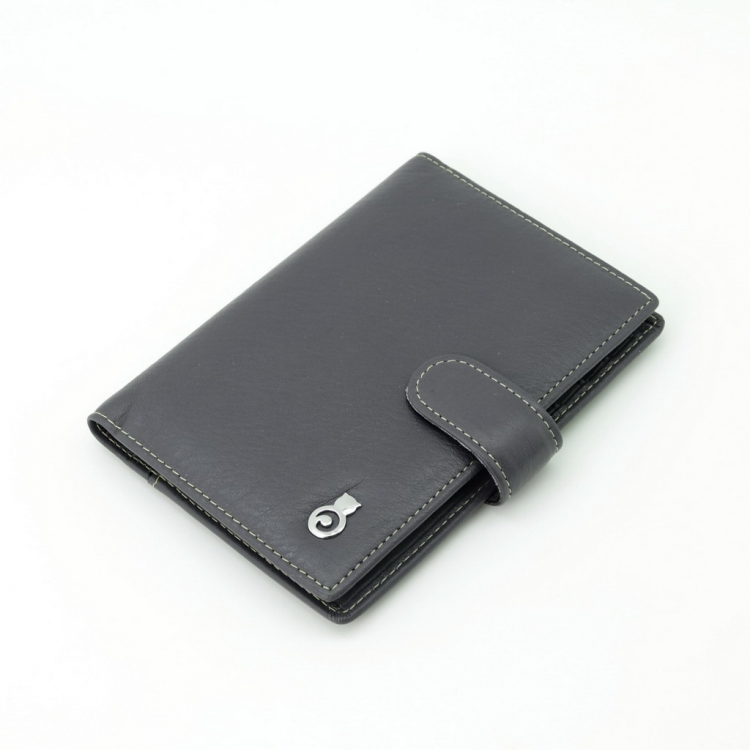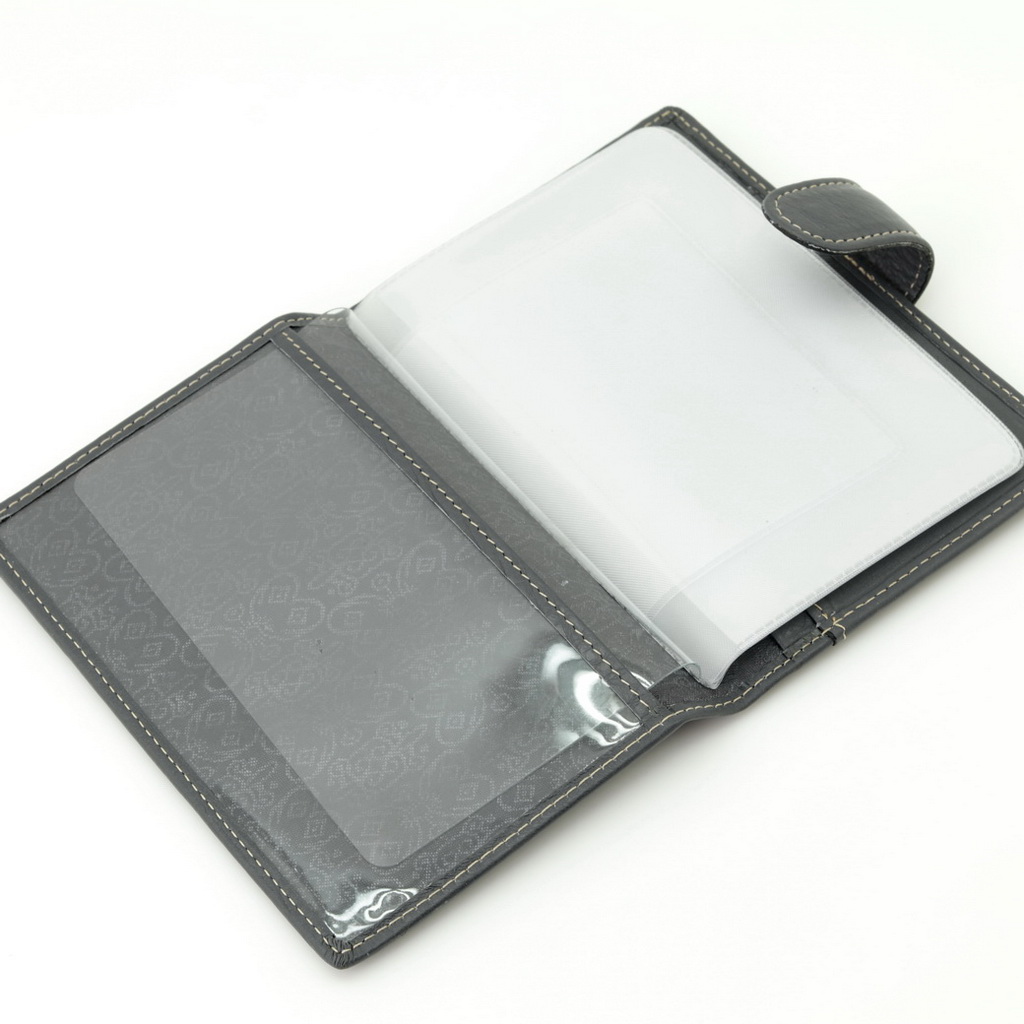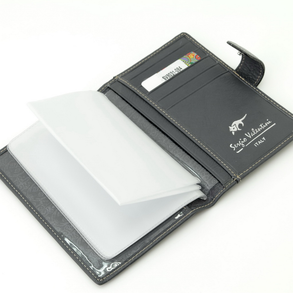 Обложка для автодокументов. Размер 10 х 13,5 см. Закрывается на хлястик с кнопкой. Внутри: слева - прозрачный захват и текстильная подкладка, справа- кожаный захват, продольный карман и четыре кармашка для пластиковых карт. Изделие укомплектовано вкладышем с прозрачными файлами для автодокументов.