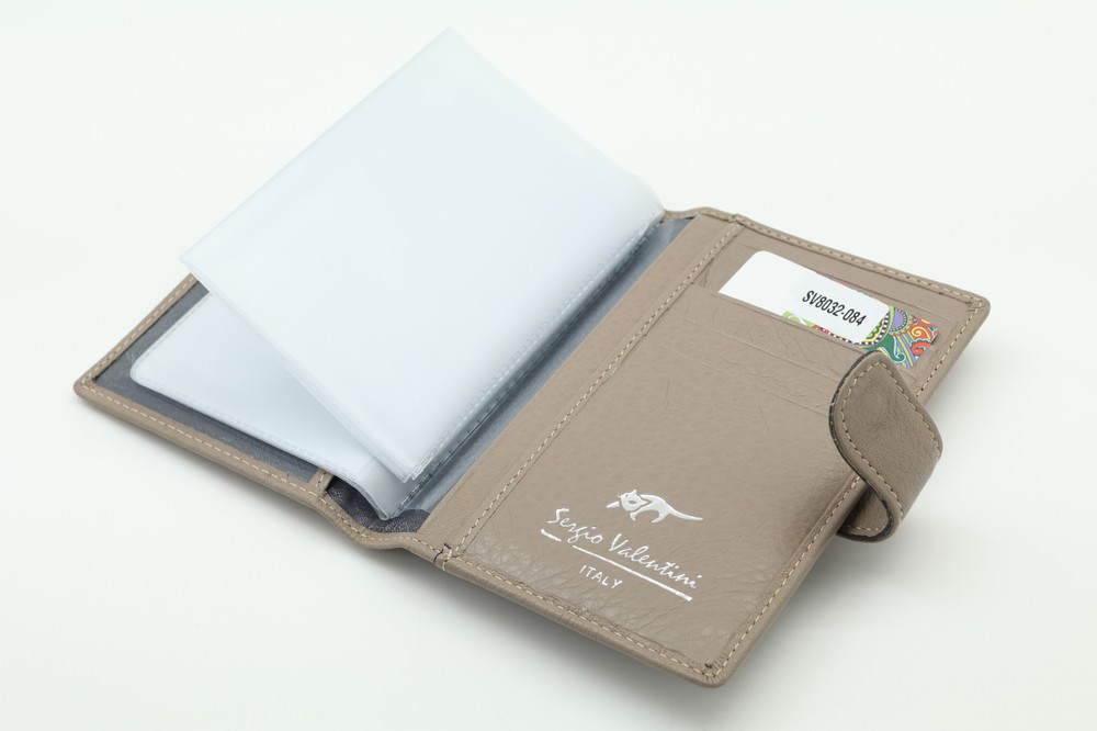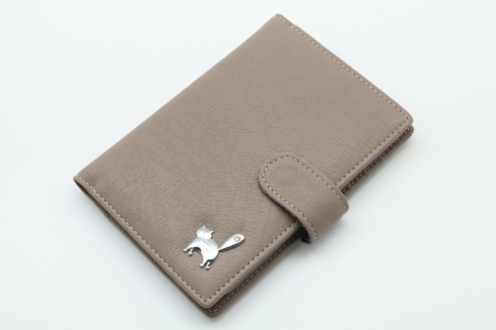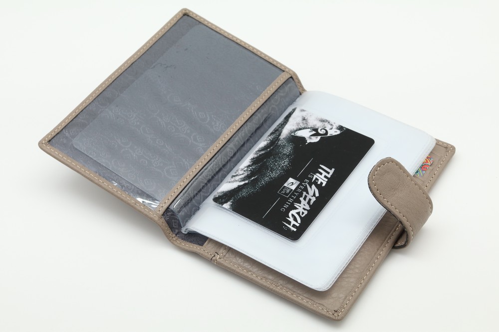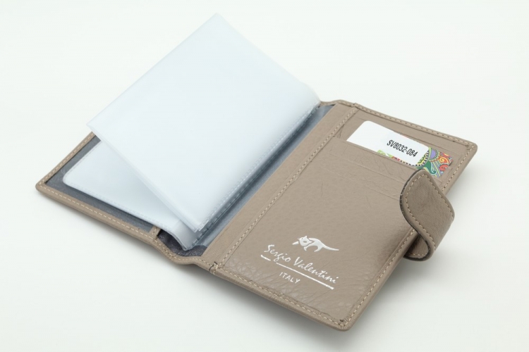 Обложка для автодокументов. Размер 10 х 13,5 см. Закрывается на хлястик с кнопкой. Внутри: слева - прозрачный захват и текстильная подкладка, справа- кожаный захват, продольный карман и четыре кармашка для пластиковых карт. Изделие укомплектовано вкладышем с прозрачными файлами для автодокументов.