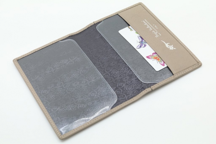 Размер 9,5 х 13,5 см. Внутри- прозрачные захваты и кожаный кармашек на правой створке.