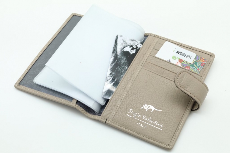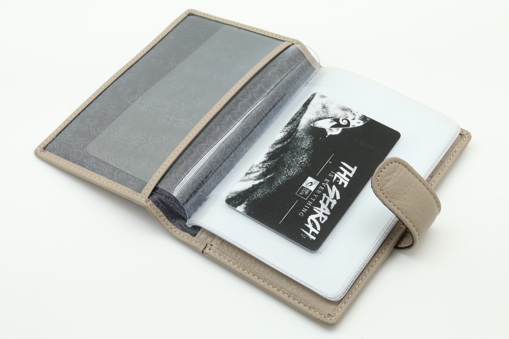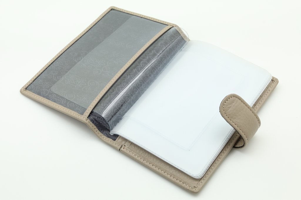 Обложка для автодокументов. Размер 10 х 13,5 см. Закрывается на хлястик с кнопкой. Внутри: слева - прозрачный захват и текстильная подкладка, справа- кожаный захват, продольный карман и четыре кармашка для пластиковых карт. Изделие укомплектовано вкладышем с прозрачными файлами для автодокументов.