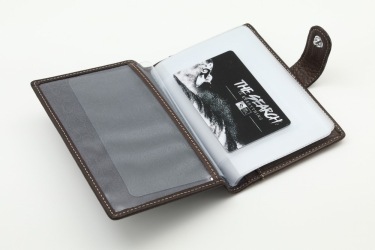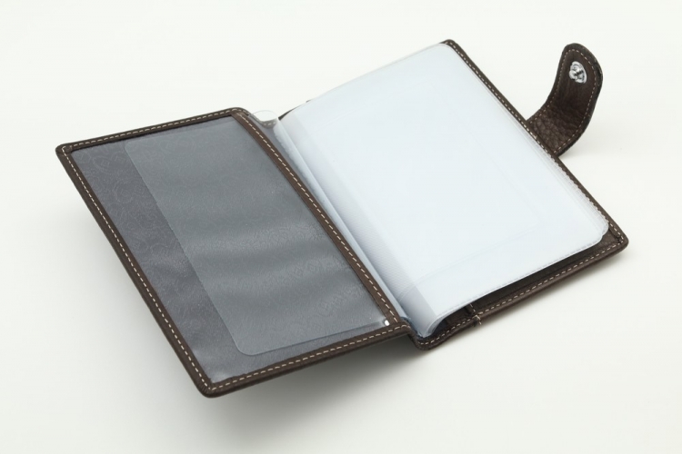 Обложка для автодокументов. Размер 10 х 13,5 см. Закрывается на хлястик с кнопкой. Внутри: слева - прозрачный захват и текстильная подкладка, справа- кожаный захват, продольный карман и четыре кармашка для пластиковых карт. Изделие укомплектовано вкладышем с прозрачными файлами для автодокументов.