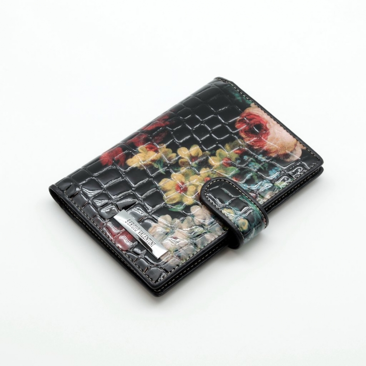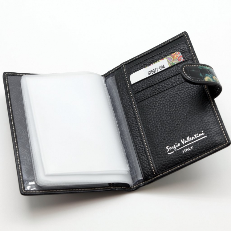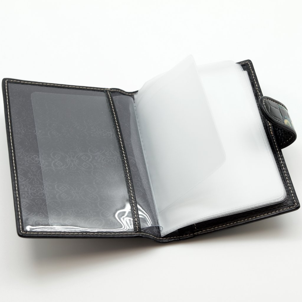 Обложка для автодокументов. Размер 10 х 13,5 см. Закрывается на хлястик с кнопкой. Внутри: слева - прозрачный захват и текстильная подкладка, справа- кожаный захват, продольный карман и четыре кармашка для пластиковых карт. Изделие укомплектовано вкладышем с прозрачными файлами для автодокументов.