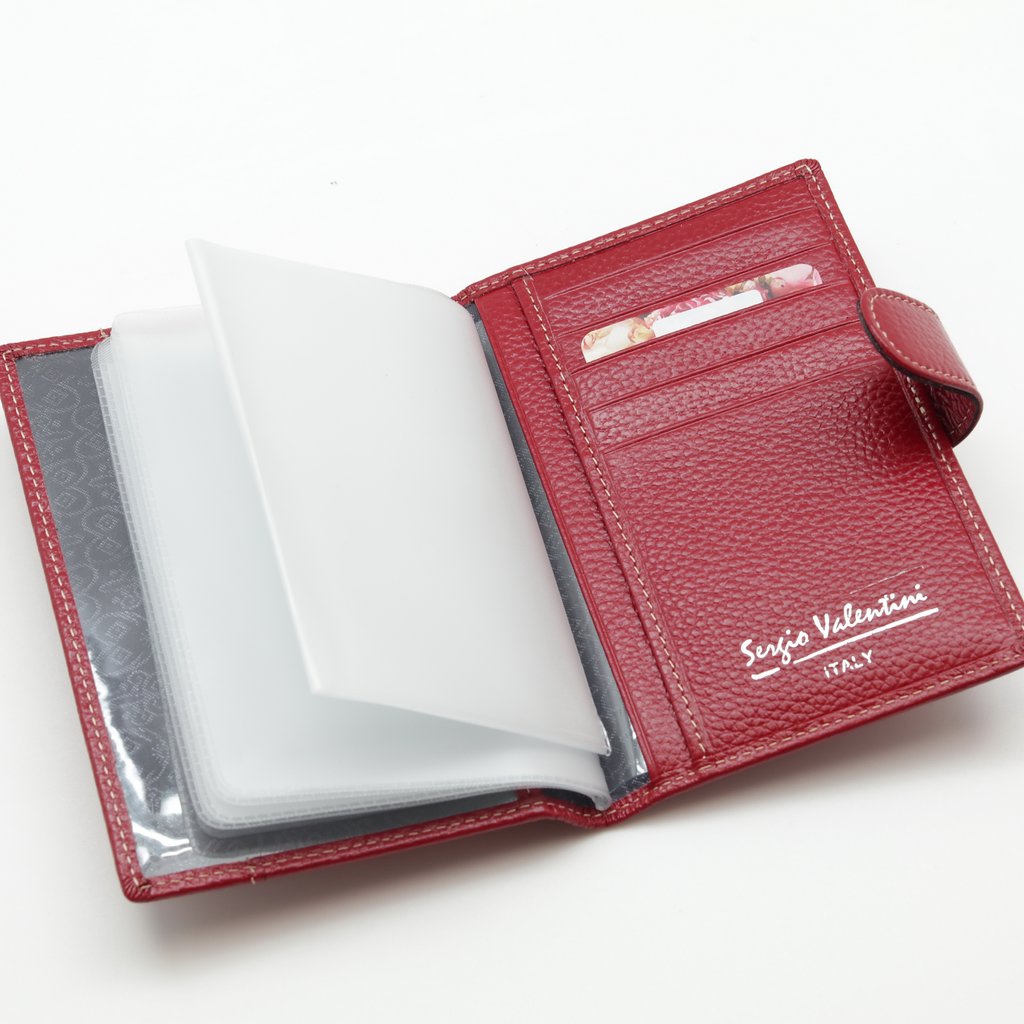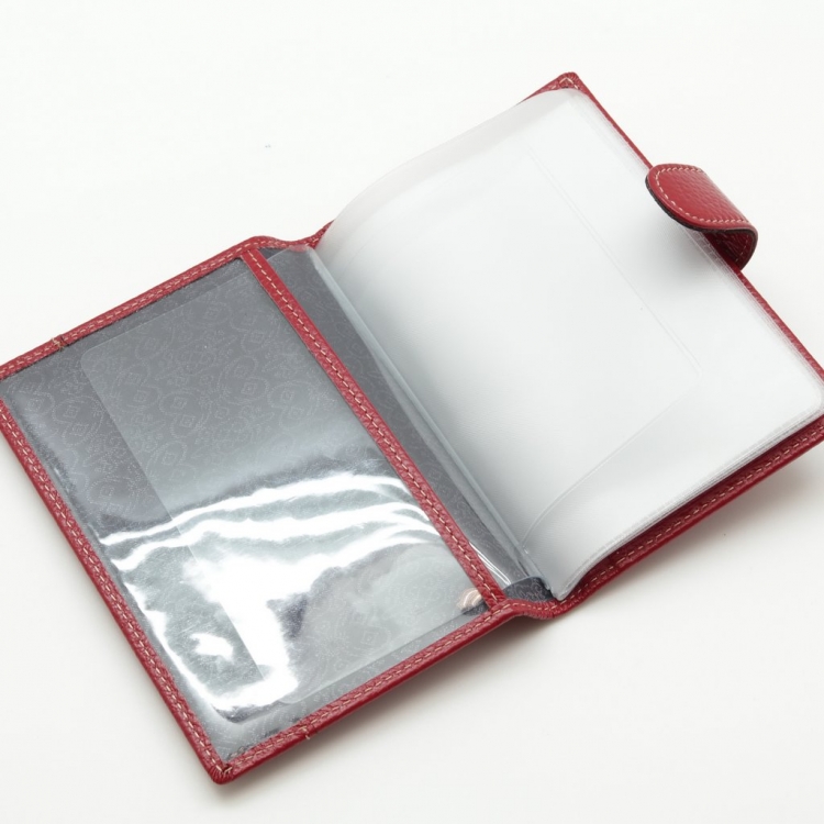 Обложка для автодокументов. Размер 10 х 13,5 см. Закрывается на хлястик с кнопкой. Внутри: слева - прозрачный захват и текстильная подкладка, справа- кожаный захват, продольный карман и четыре кармашка для пластиковых карт. Изделие укомплектовано вкладышем с прозрачными файлами для автодокументов.