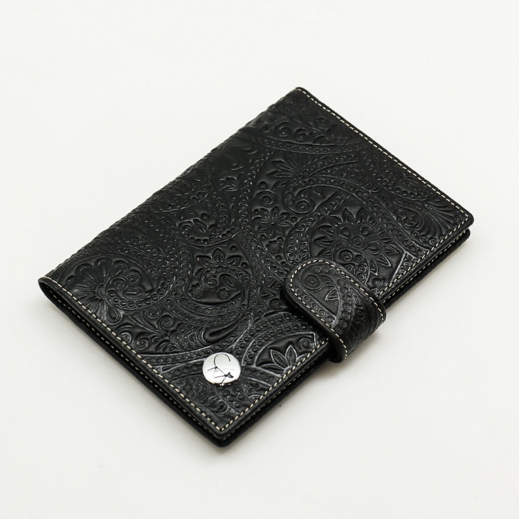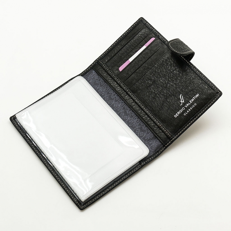 Обложка для автодокументов. Размер 10 х 13,5 см. Закрывается на хлястик с кнопкой. Внутри: слева - прозрачный захват и текстильная подкладка, справа- кожаный захват, продольный карман и четыре кармашка для пластиковых карт. Изделие укомплектовано вкладышем с прозрачными файлами для автодокументов.