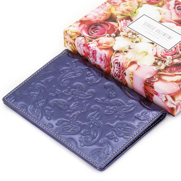 Размер 9,5 х 13,5 см. На внутренней стороне обложки прозрачный захват и кожаный кармашек с левой стороны, кожаный захват и три кармашка для карточек с правой стороны.