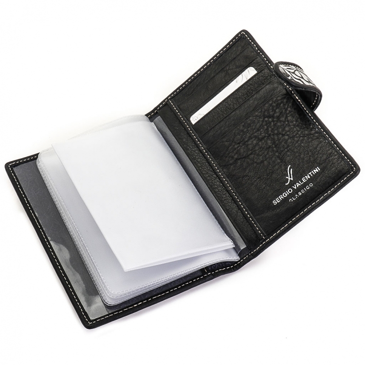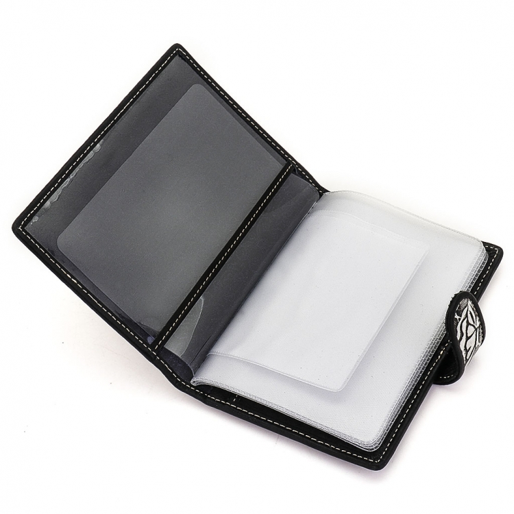 Обложка для автодокументов. Размер 10 х 13,5 см. Закрывается на хлястик с кнопкой. Внутри: слева - прозрачный захват и текстильная подкладка, справа- кожаный захват, продольный карман и четыре кармашка для пластиковых карт. Изделие укомплектовано вкладышем с прозрачными файлами для автодокументов.