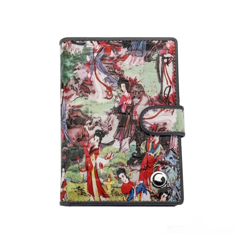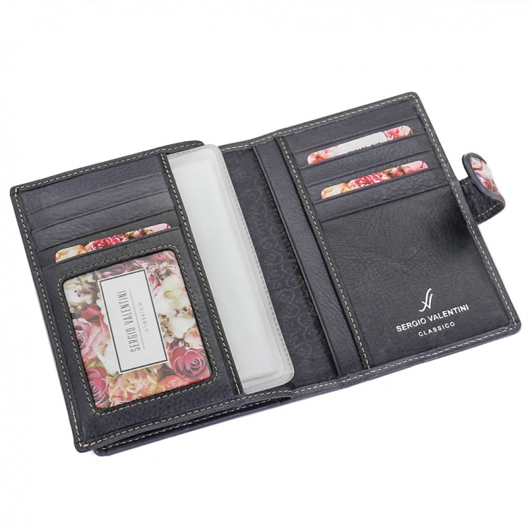 Размер 10 х 13,5 х 2 см. Закрывается на хлястик с кнопкой. Внутри: отделение для паспорта, отделение с прозрачным вкладышем для автодокументов, на левой створке: три кармашка для пластиковых карт, прозрачный карман для фотографии, на правой створке: пять кармашков для карточек и один боковой карман. Изделие упаковано в фирменную коробку.