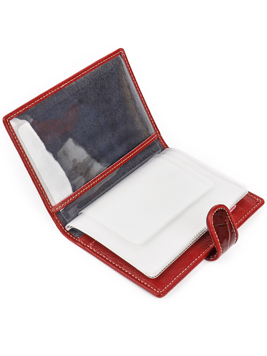 Обложка для автодокументов. Размер 10 х 13,5 см. Закрывается на хлястик с кнопкой. Внутри: слева - прозрачный захват и текстильная подкладка, справа- кожаный захват, продольный карман и четыре кармашка для пластиковых карт. Изделие укомплектовано вкладышем с прозрачными файлами для автодокументов.
