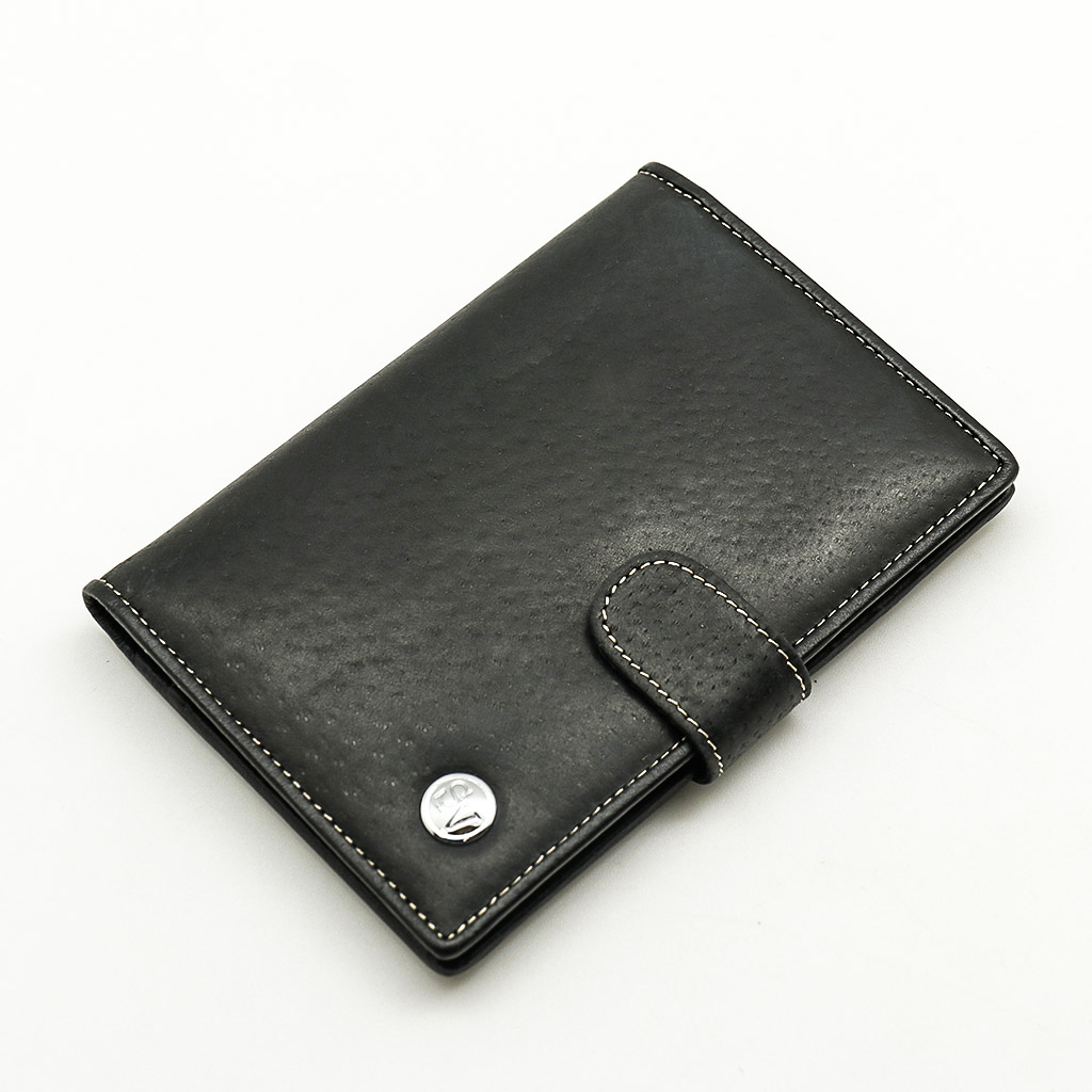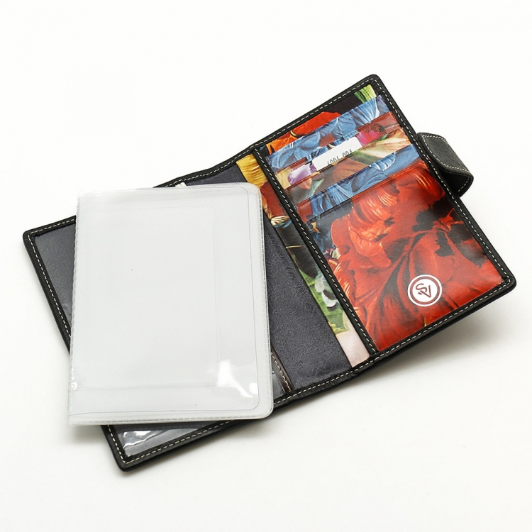 Обложка для автодокументов. Размер 10 х 13,5 см. Закрывается на хлястик с кнопкой. Внутри: слева - прозрачный захват и текстильная подкладка, справа- кожаный захват, продольный карман и четыре кармашка для пластиковых карт. Изделие укомплектовано вкладышем с прозрачными файлами для автодокументов.