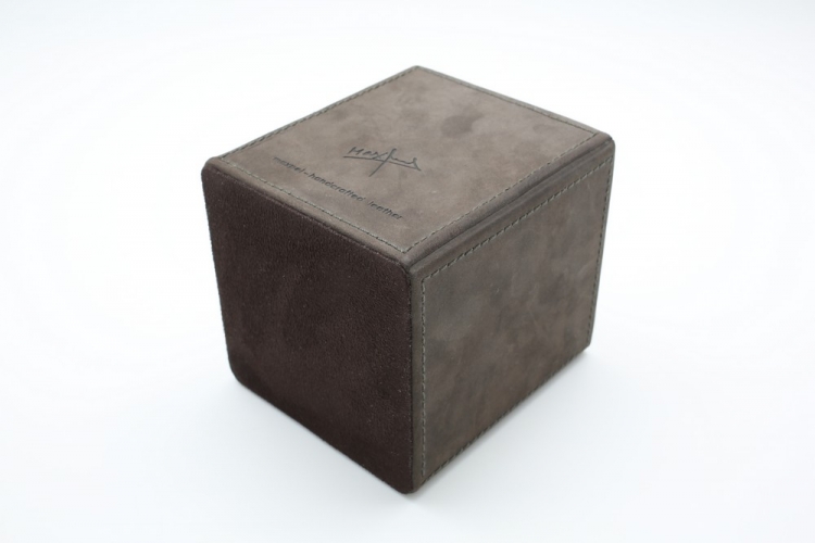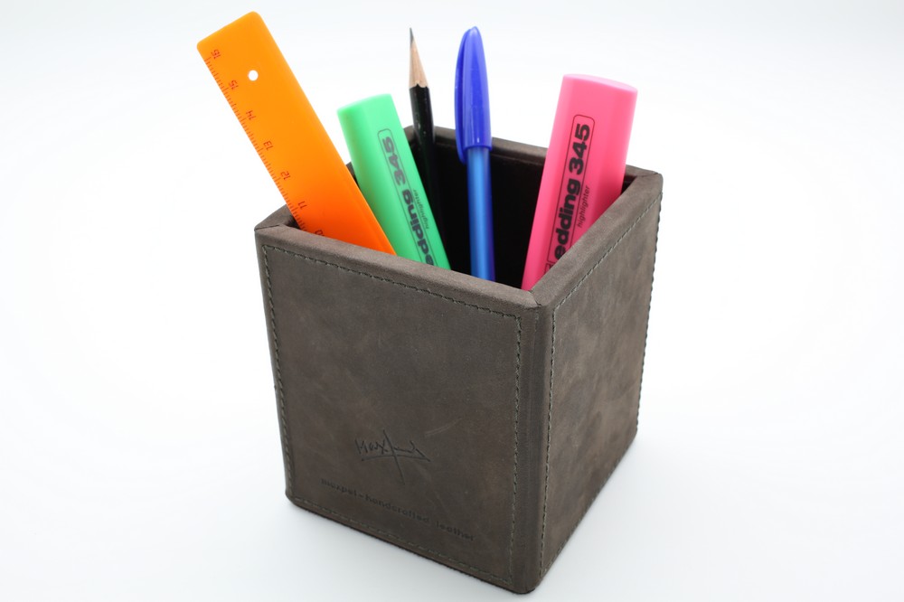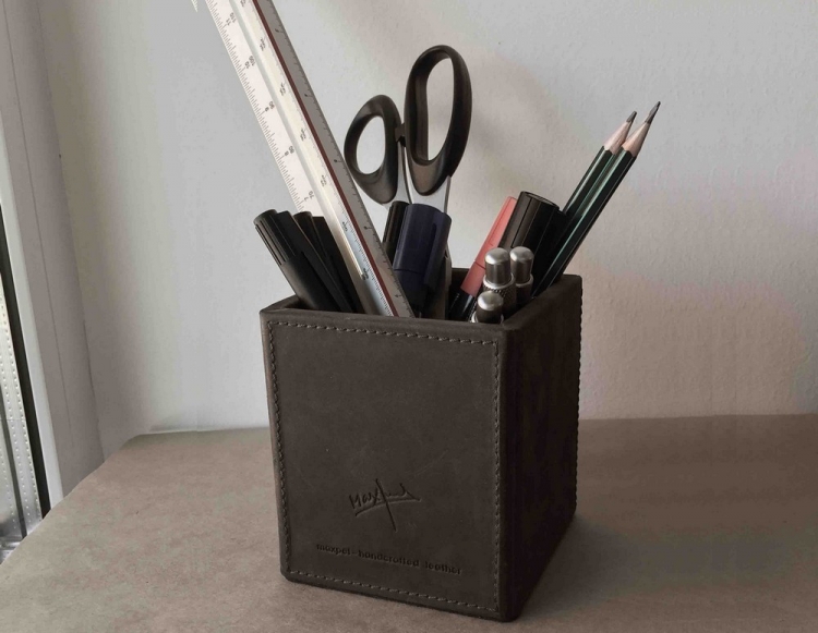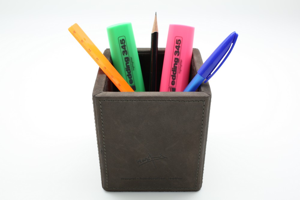 Размер 9,5 х 9,5 х 10,5 см. Подставка для пишущих принадлежностей обтянута отборной итальянской кожей тёмно- коричневого цвета. При изготовлении изделия использована значительная доля ручного труда.