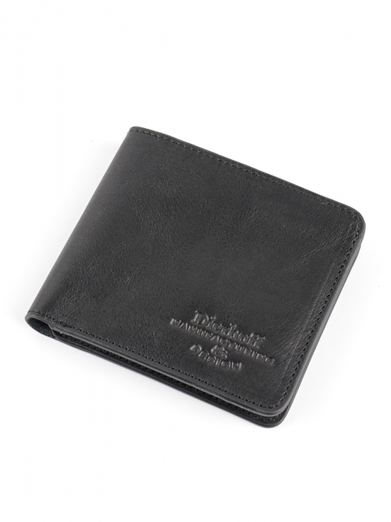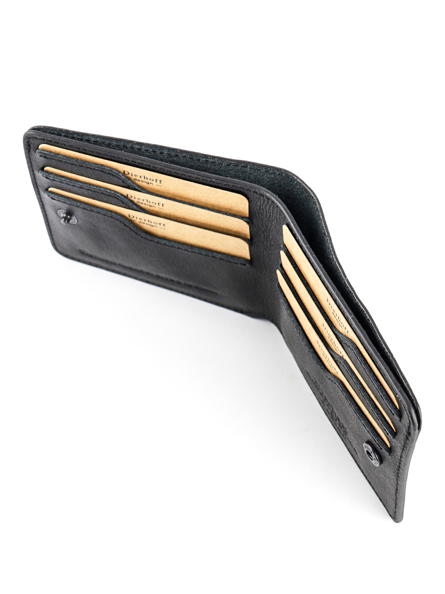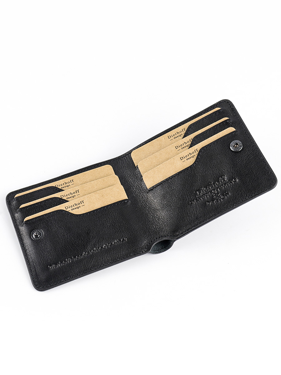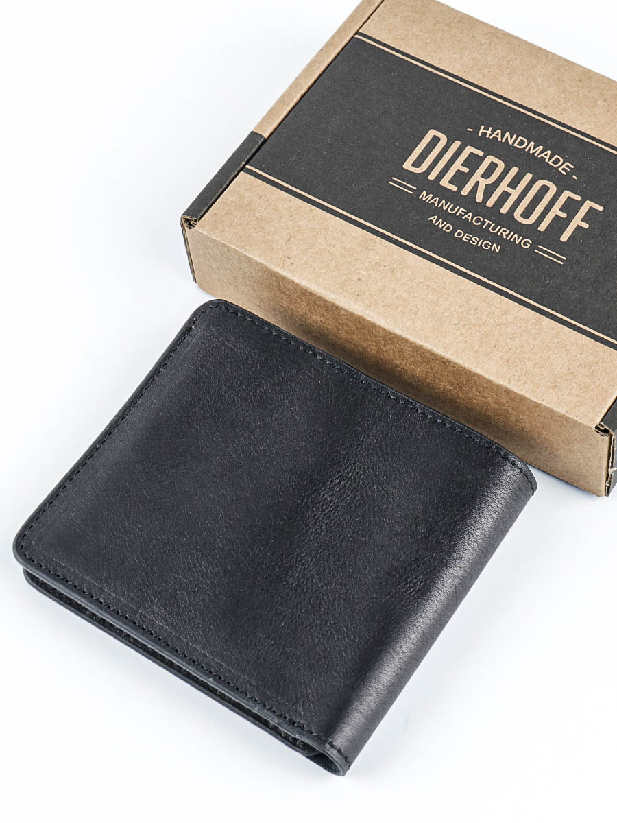 Размер 10,5 х 9 см. Закрывается на кнопку. Внутри одно отделение для купюр и шесть кармашков для пластиковых карт. Изготовлено с использованием значительной доли ручного труда из высококачественной мягкой кожи. Портмоне упаковано в подарочную коробку Dierhoff.