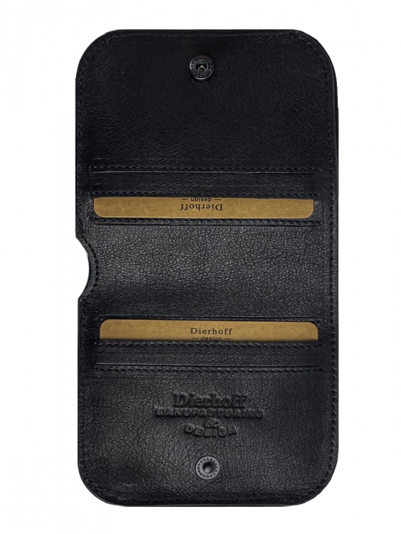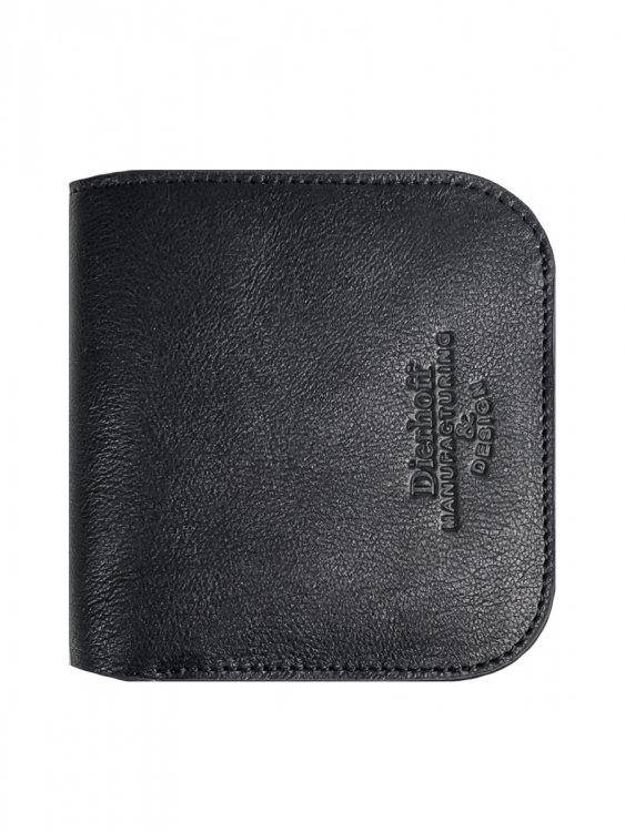 Размер 10,5 х 10,5 см. Закрывается на кнопку. Внутри одно отделение для купюр и шесть кармашков для пластиковых карт. Снаружи, на тыльной стороне, отделени для монет на кнопке. Изготовлено с использованием значительной доли ручного труда из высококачественной натуральной кожи. Портмоне упаковано в подарочную коробку Dierhoff