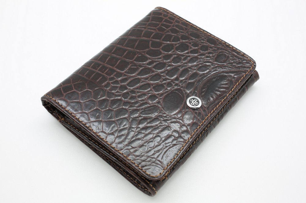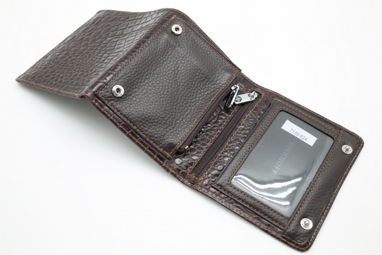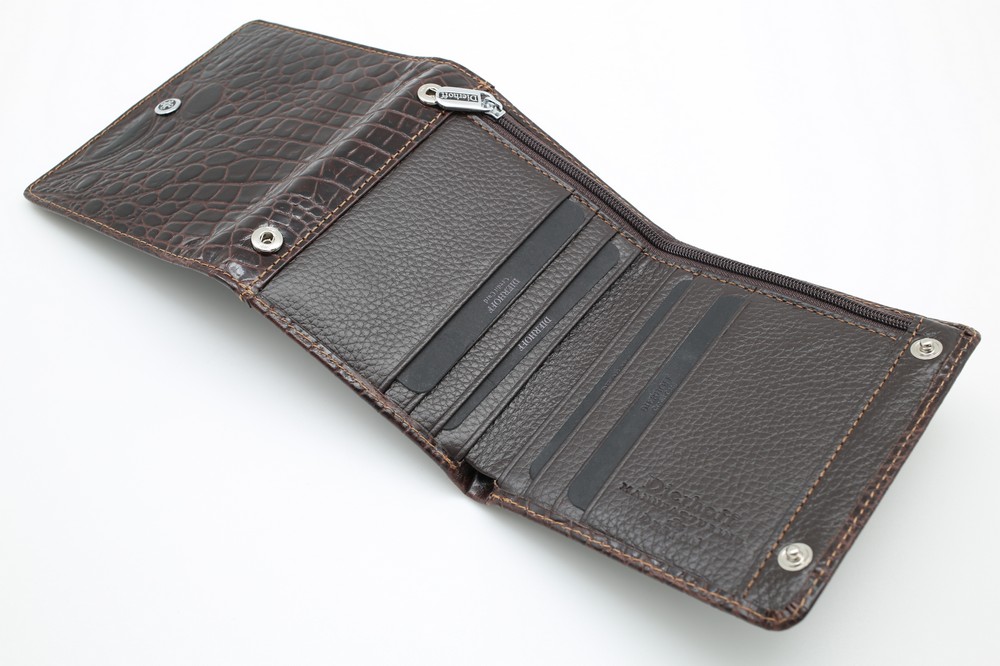 Размер 12 х 10 см. Двухстороннее портмоне, закрывающееся на две кнопки с каждой стороны. Внутри первого отделения: два кармашка на молнии для монет и мелких предметов, прозрачное окошко для фотографии. Внутри второго отделения: восемь кармашков для пластиковых карт и два кармана для купюр (один на молнии).