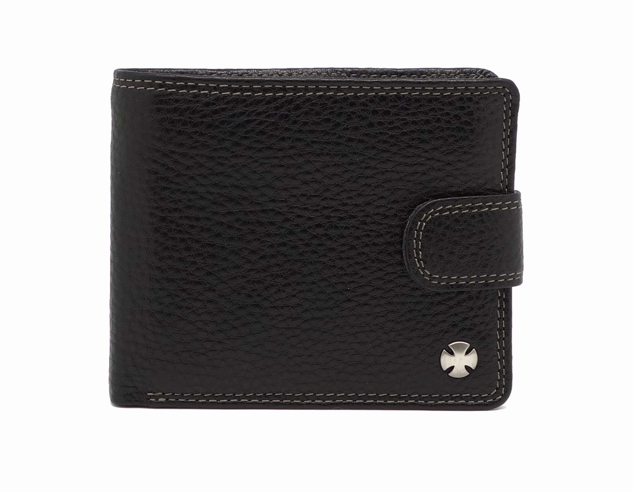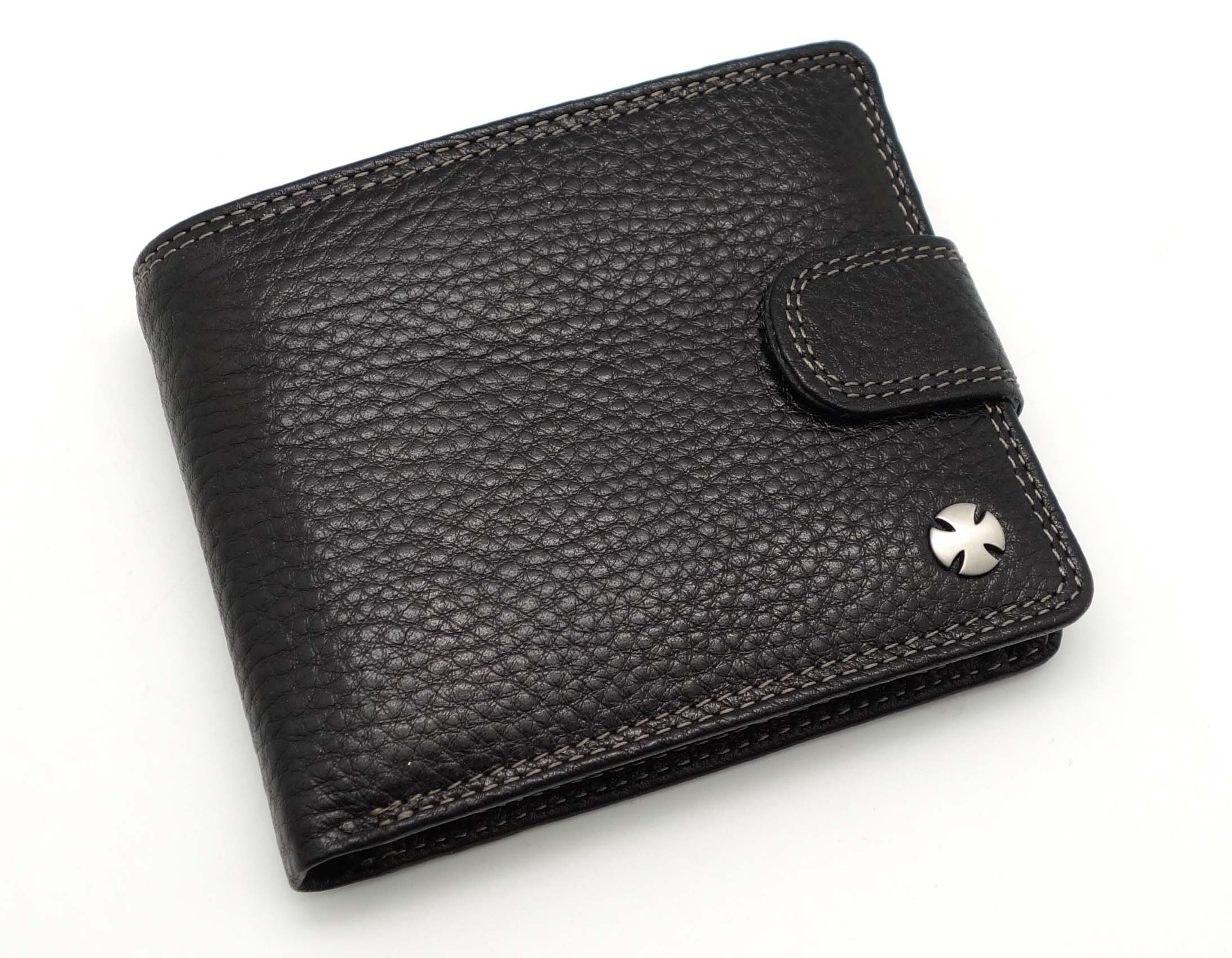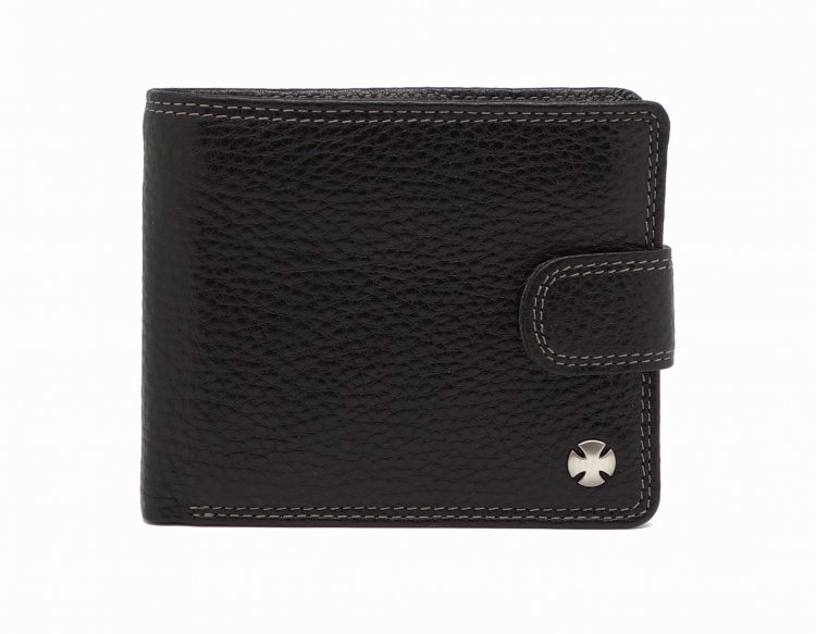 Размер 11,5 х 9,5 см. Закрывается на хлястик с кнопкой. Внутри: три отделения для купюр, одно из которых на молнии, два боковых кармана, семь кармашков для пластиковых карт, два прозрачных окошка, отделение для монет, закрывающееся клапаном на кнопке.