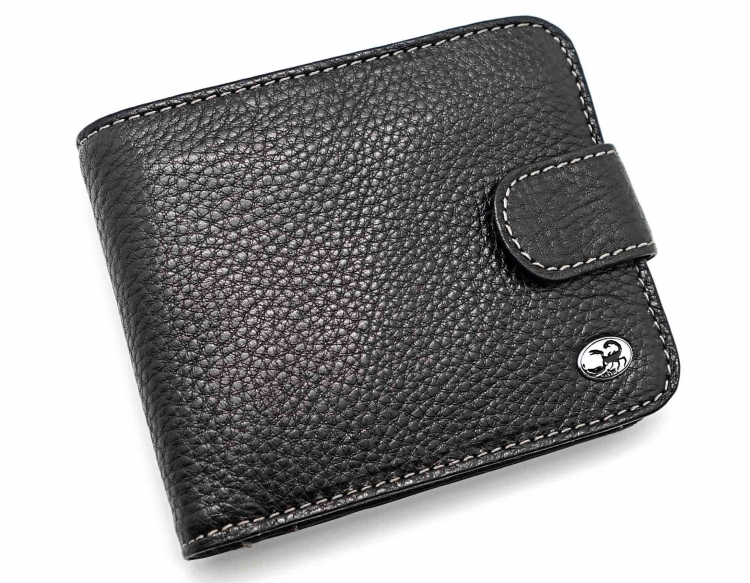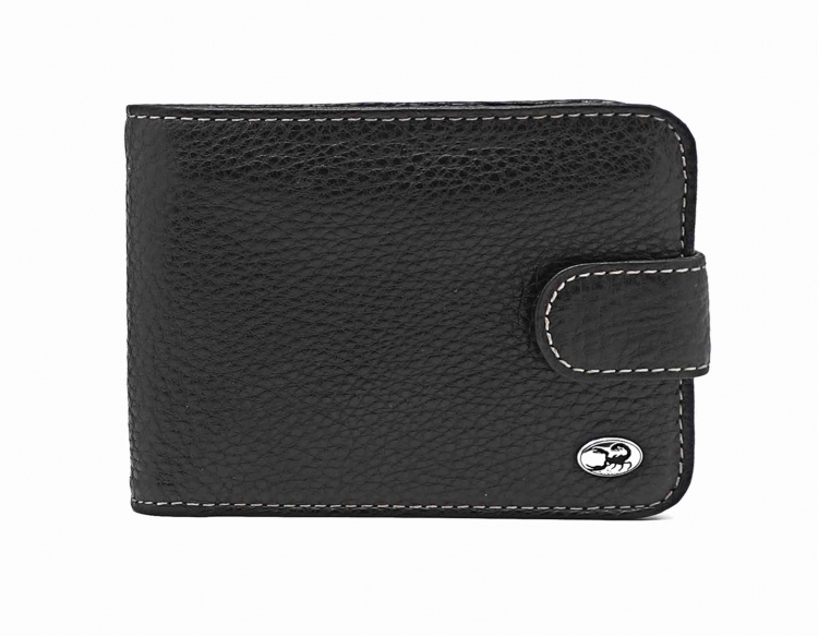Размер 11,5 х 9,5 см. Закрывается на хлястик с кнопкой. Внутри: три отделения для купюр, одно из которых на молнии, два боковых кармана, семь кармашков для пластиковых карт, два прозрачных окошка, отделение для монет, закрывающееся клапаном на кнопке.